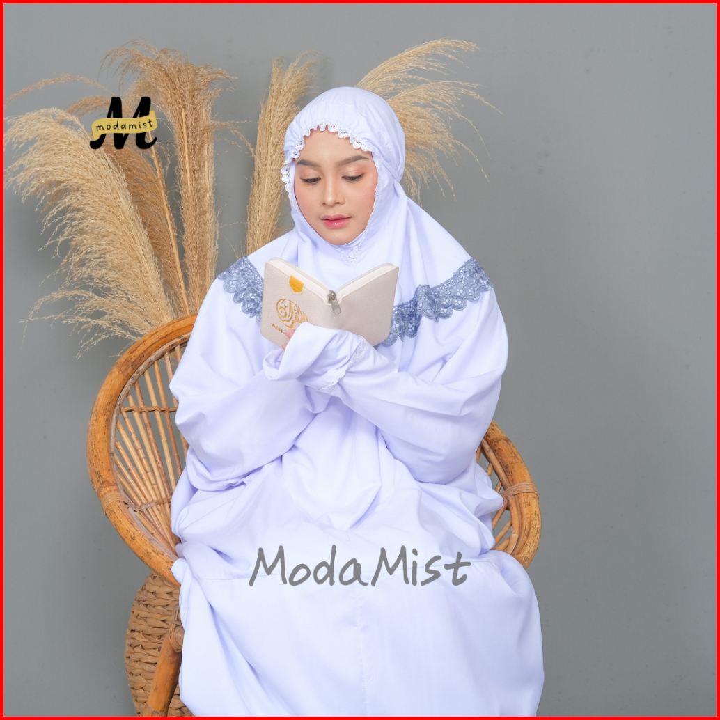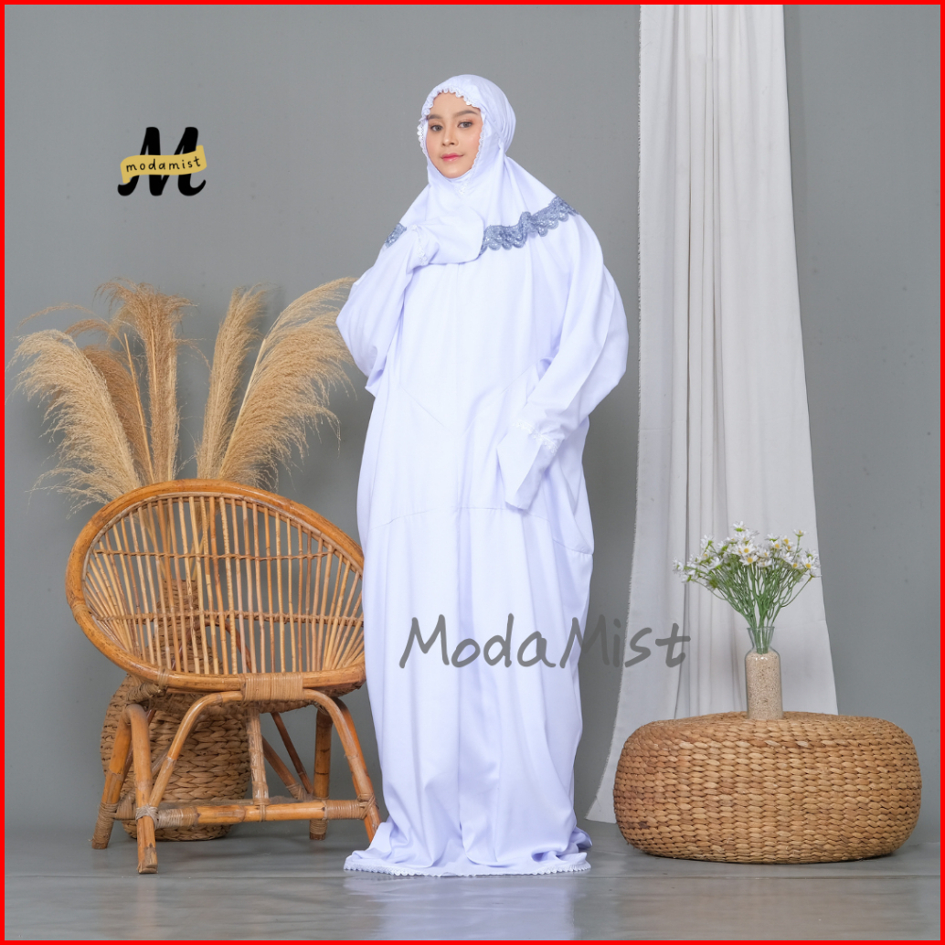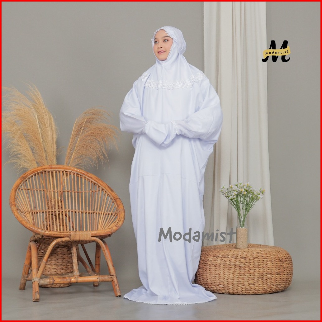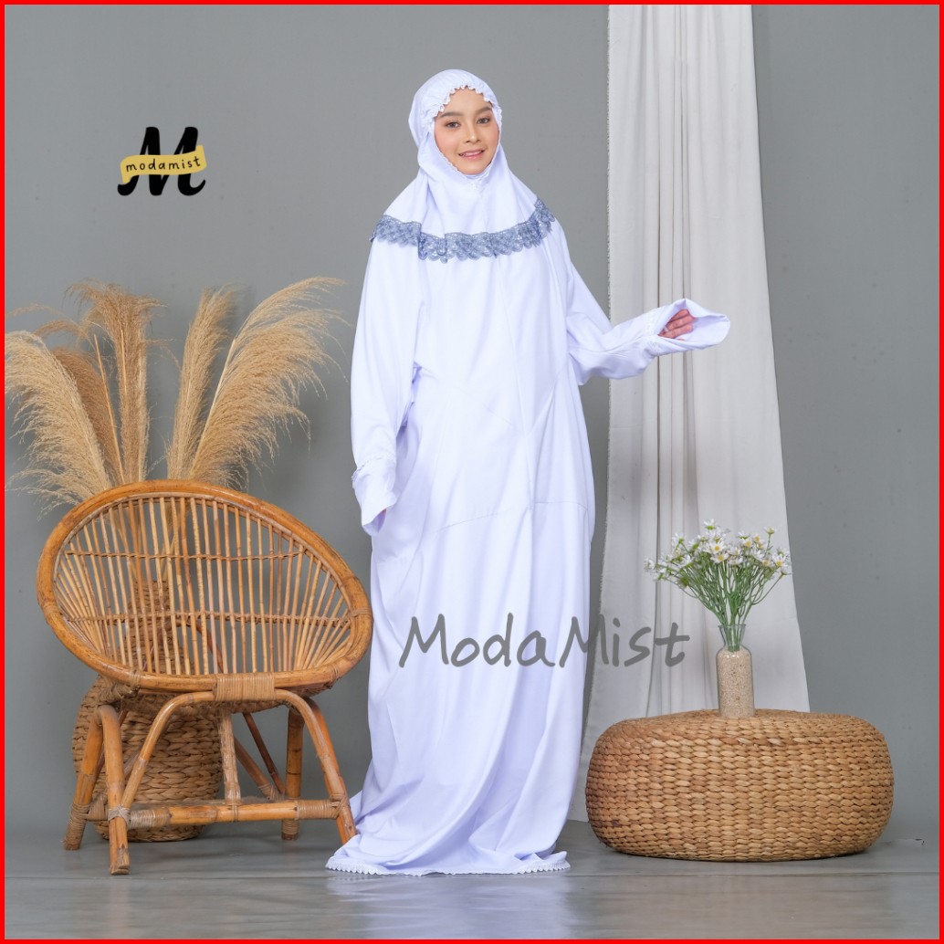 Mukena Terusan Dewasa Katun Putih Polos Renda Gipper Kalung Traveling