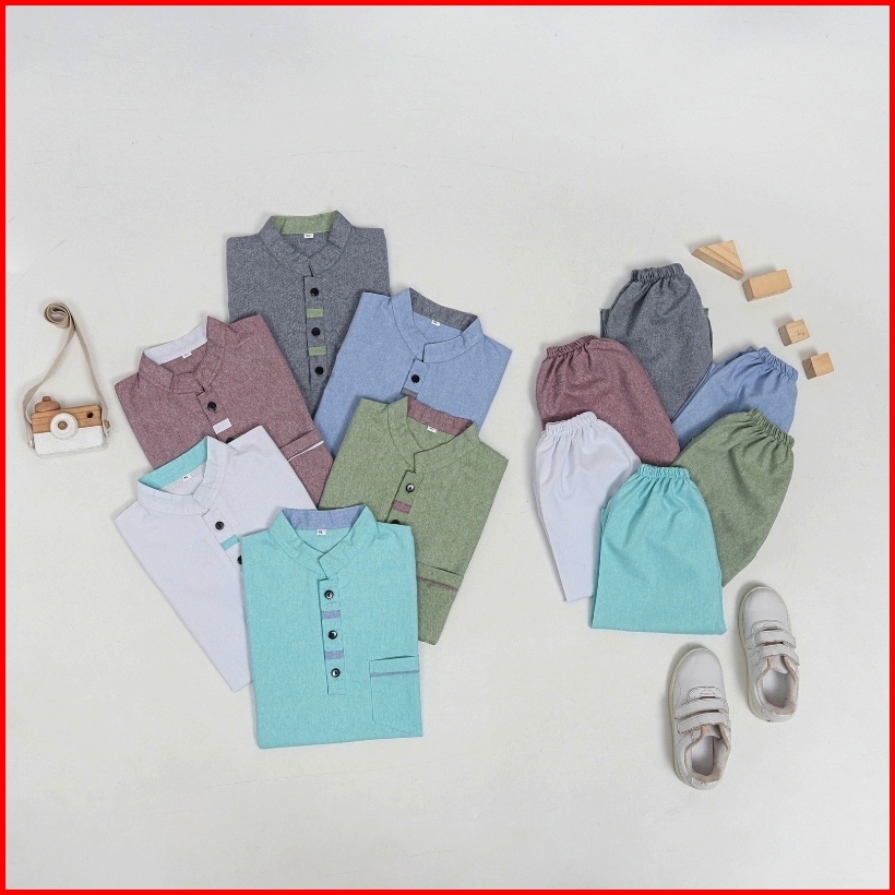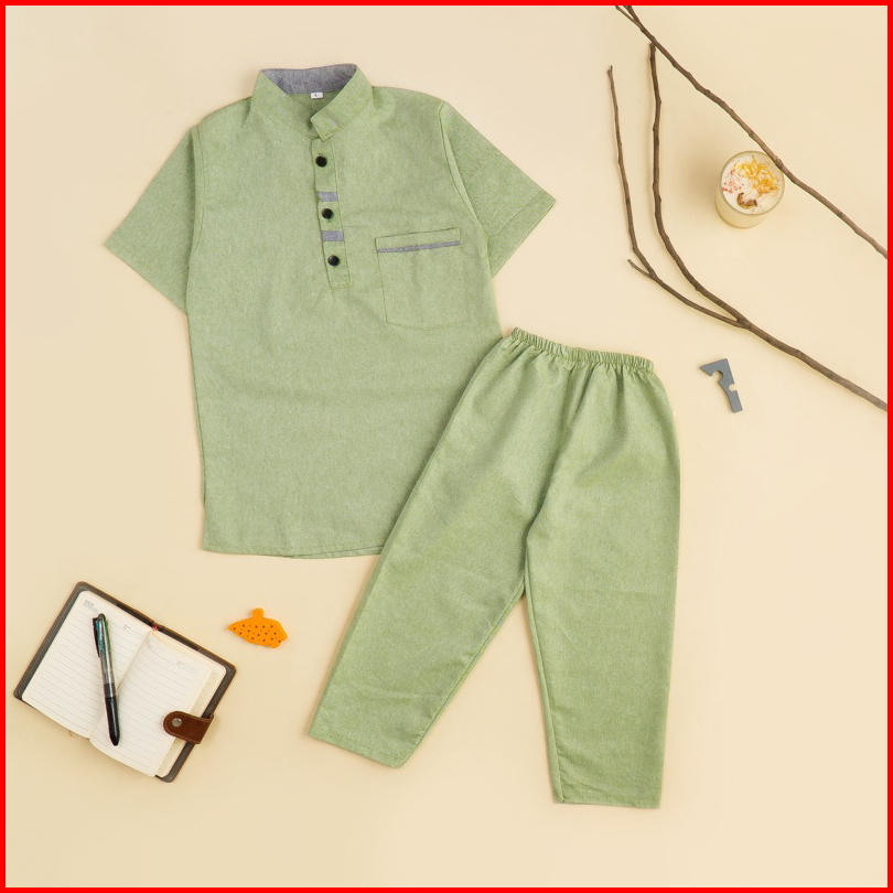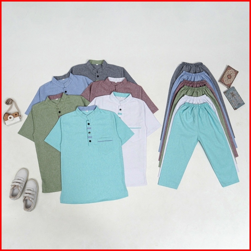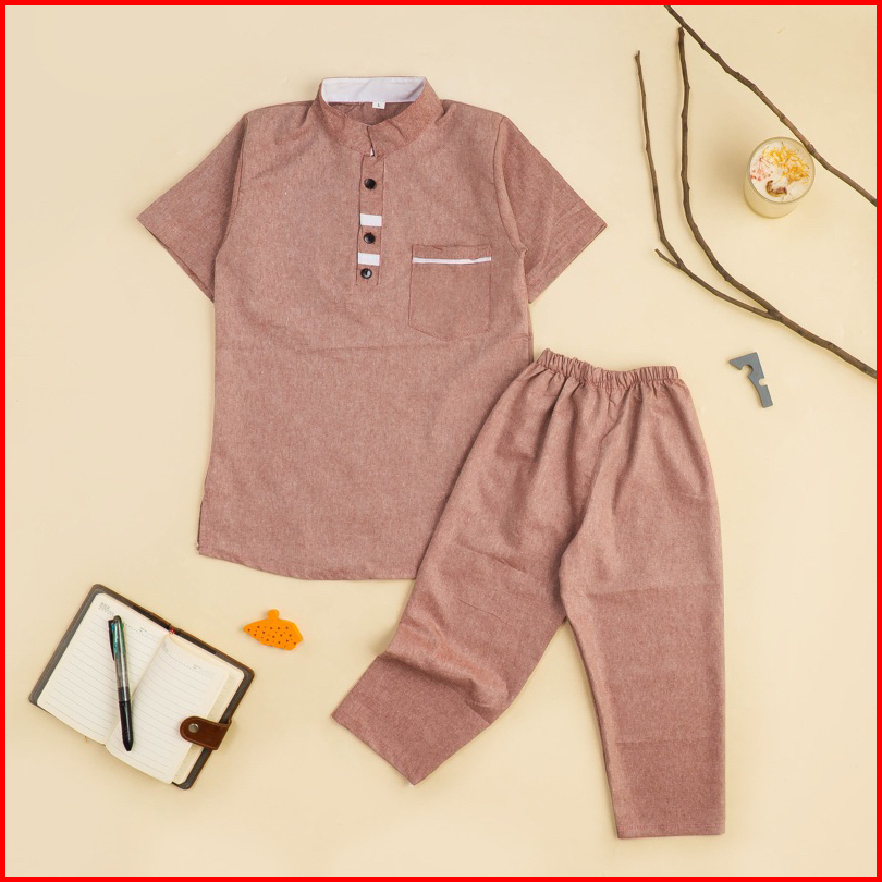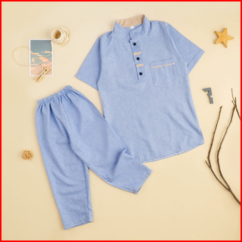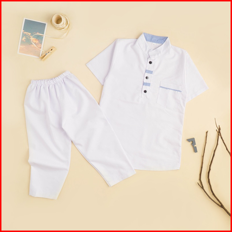 Set Koko Kurta Oxford Anak Laki-laki Setelan Busana Muslim Anak Cowok Lengan Pendek 1-10 Tahun
