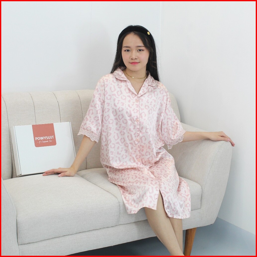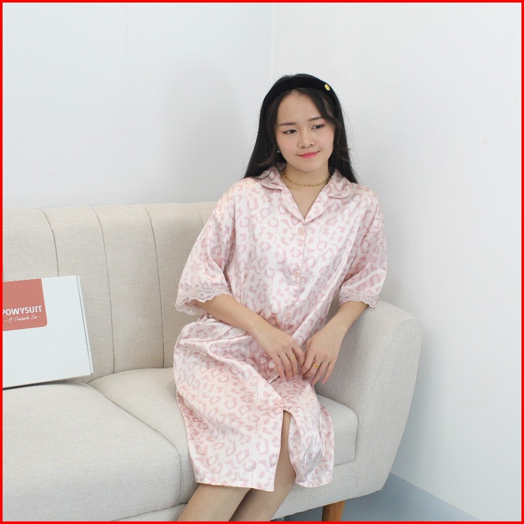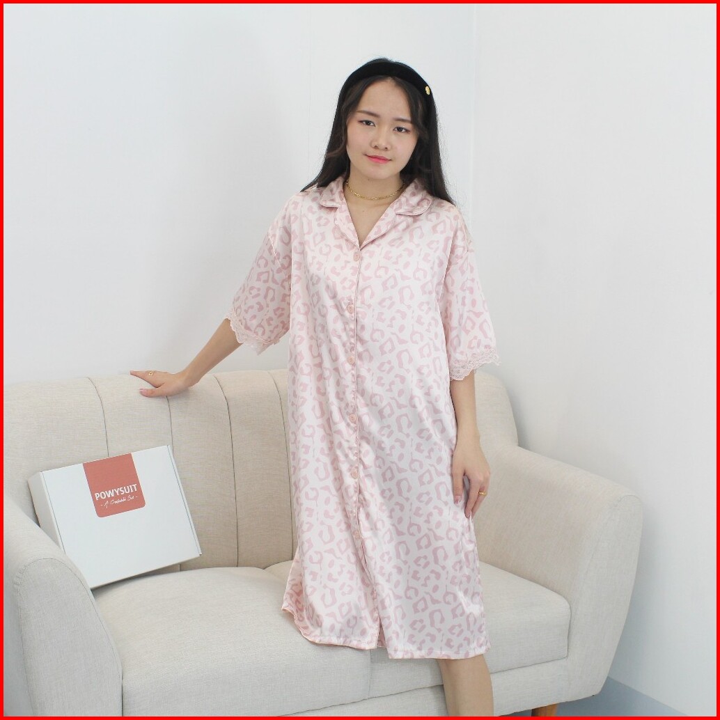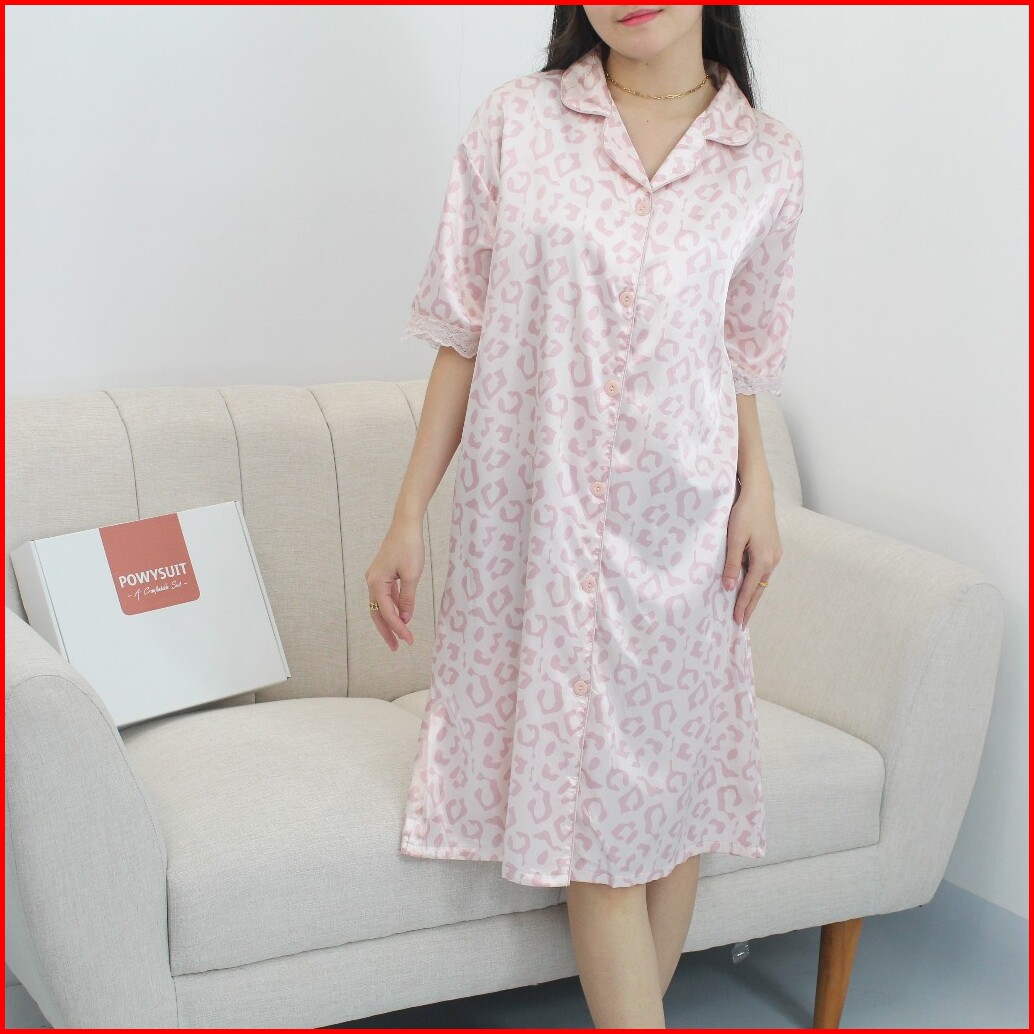 Gn17 Leopard Daster Powysuit Dress Wanita Satin Dewasa Motif Kancing Baju Tidur Dress Busui