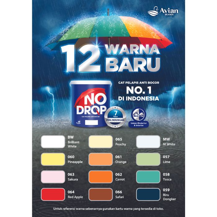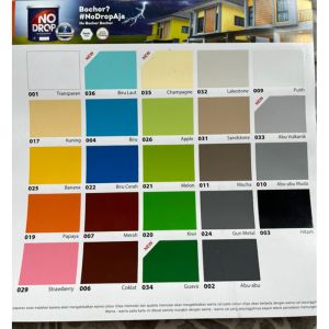 001 TRANSPARAN, 002 ABU-ABU, 003 HITAM, 004 BIRU, 006 COKLAT, 007 MERAH, 009 PUTIH, 010 ABU-ABU MUDA, 011 MOCHA, 017 KUNING, 019 PAPAYA, 020 KIWI, 021 MELON, 022 BIRU CERAH, 024 GUN METAL, 025 BANANA, 026 APPLE, 029 STRAWBERRY, 031 SANDSTONE, 032 LAKESTONE, 033 ABU VULKANIK, 034 GUAVA, 035 CHAMPAGNE, 036 BIRU LAUT, 057 Lime, 058 Tosca, 059 Biru Dongker, 060 Pineapple, 061 Orange, 062 Carrot, 063 Sakura, 064 Red Apple, 065 Peachy, 066 Safari, BW Brilliant White, MW M White