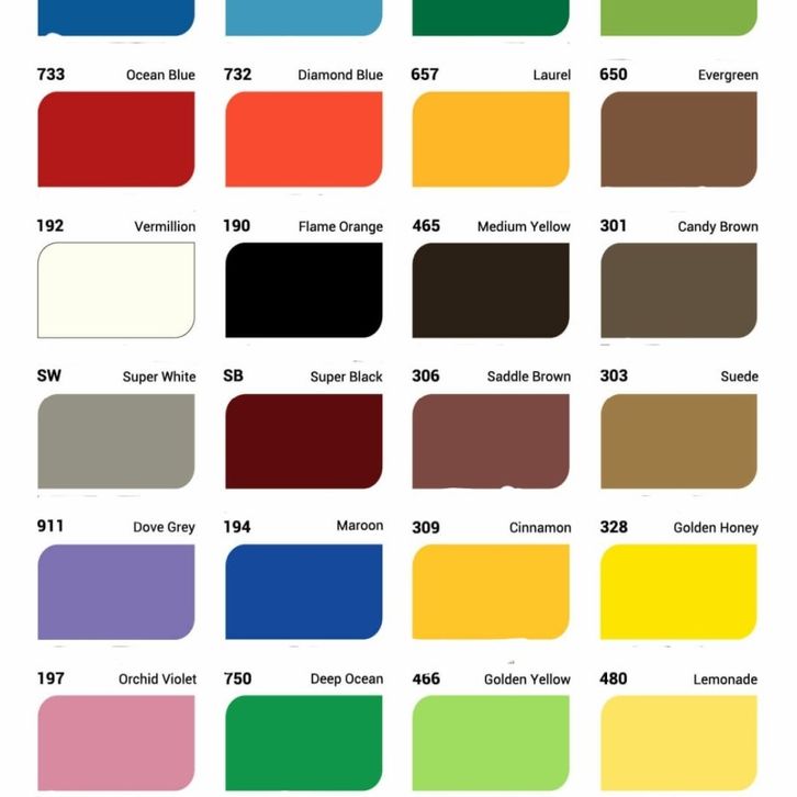 110, 179, 189, 190, 191, 192, 194, 197, 198, 199, 301, 301M-CANDY BROWN MAT, 303, 303M-SUEDE MATT, 305, 306, 309, 309M-CINNAMON, 310, 328, 329, 330, 331, 333, 334, 370, 461, 462, 465, 466, 470, 480, 630, 631, 642, 645, 648, 650, 651, 652, 657, 660, 662, 670, 671, 731, 732, 733, 733MATT-OCEAN BLUE, 750, 752, 753, 754, 755, 911, 911M-DOVE GREY MATT, 915, 915M-DARK GREY MATT, 924, SBM- S.BLACK MAT, SUPER BLACK, SUPER WHITE, SWM-S.WHITE MATT
