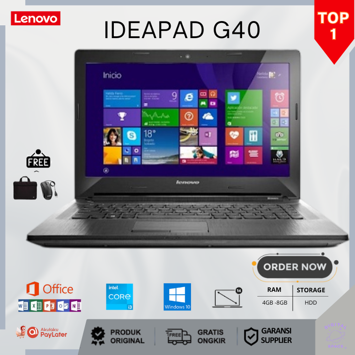 Laptop Lenovo Ideapad G40 Intel Core i3 Ram 8GB 1 TB Windows 10 Free Tas Free Mouse Laptop Lenovo Second Original Garans