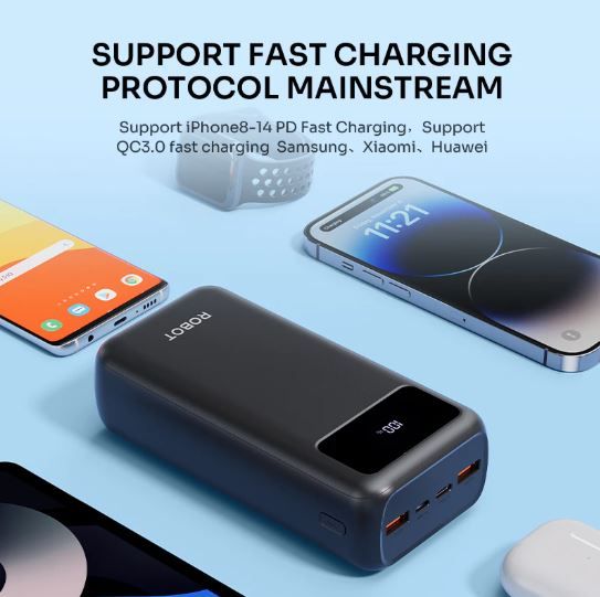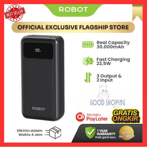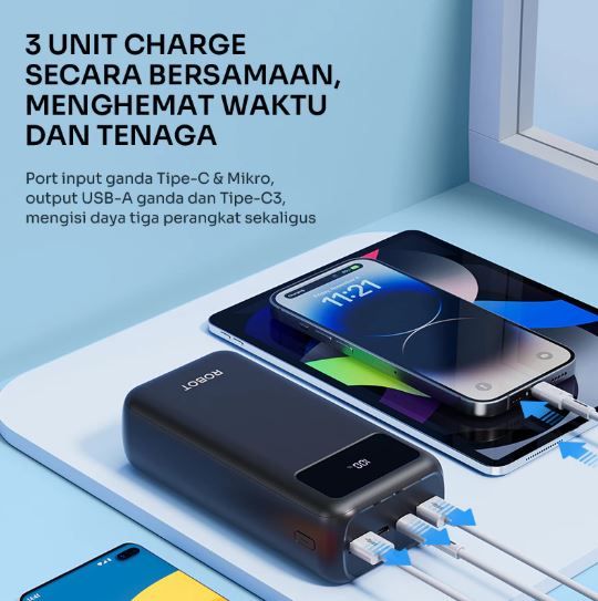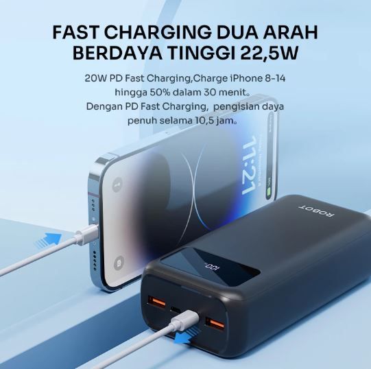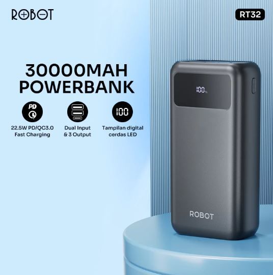 ROBOT Powerbank 30000 mAh Fast Charging 22.5W 3 Port USB Type C LED RT32 Original