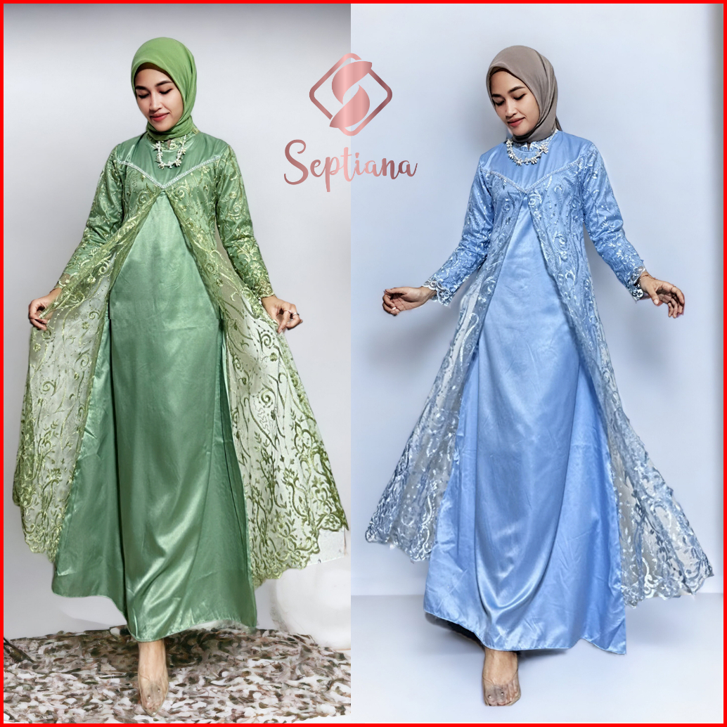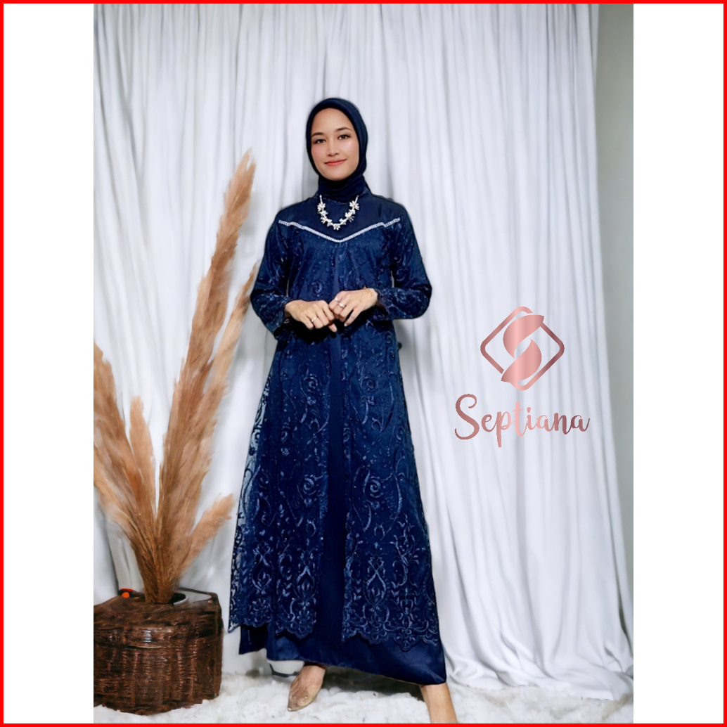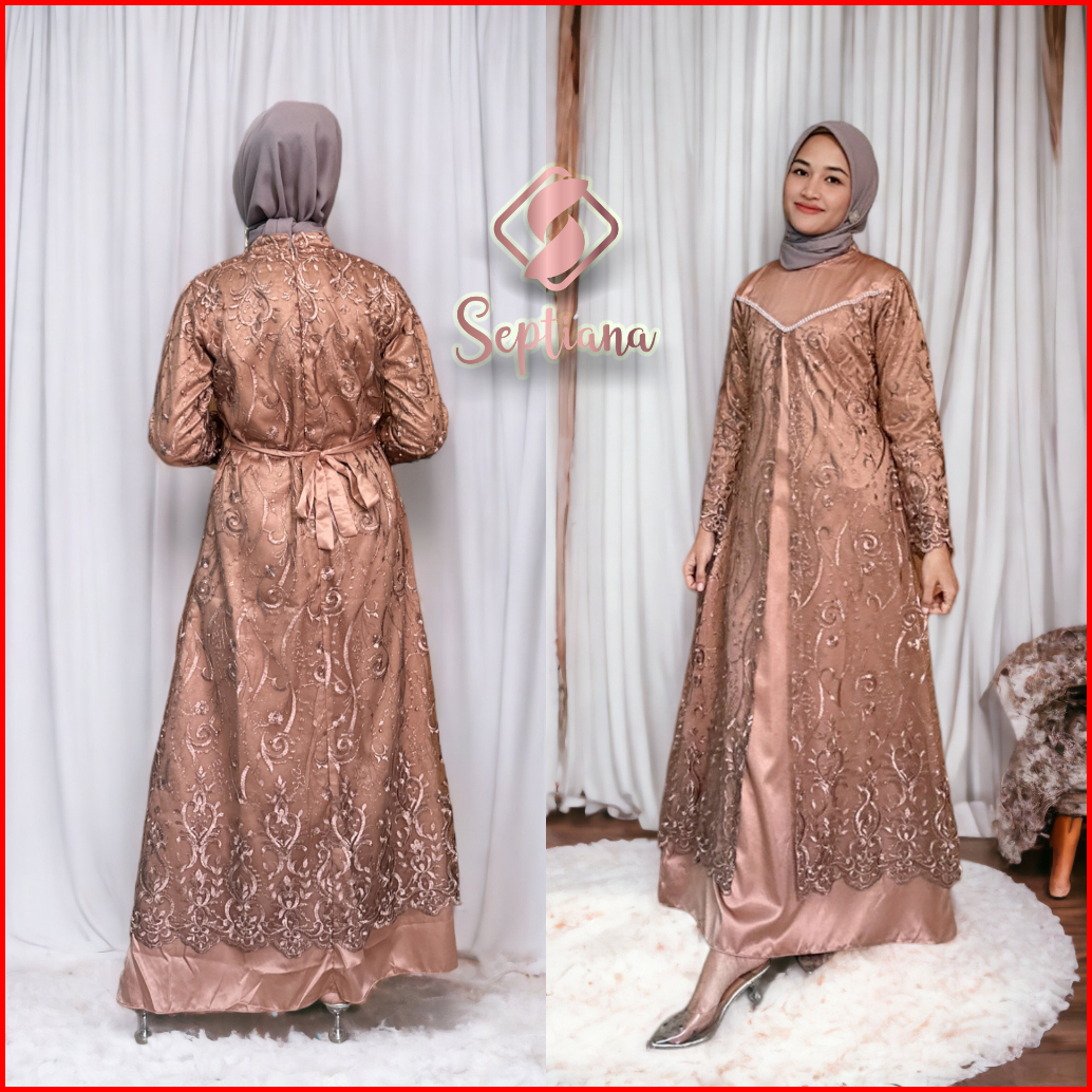 Septiana Gamis Pesta Kondangan Brukat Tille Mutiara Lapisan Satin Maxi Dress Pesta Kerah Shanghai Brokat Terbaru Mewah