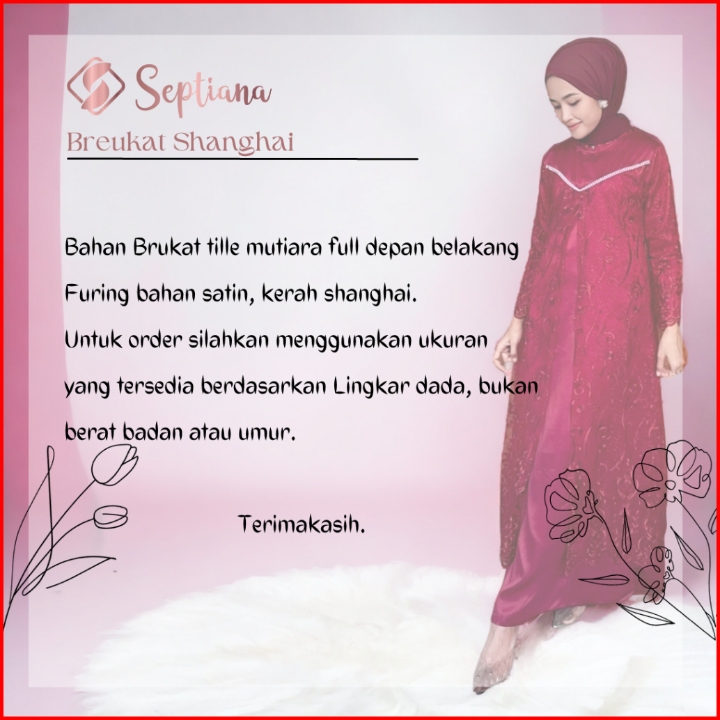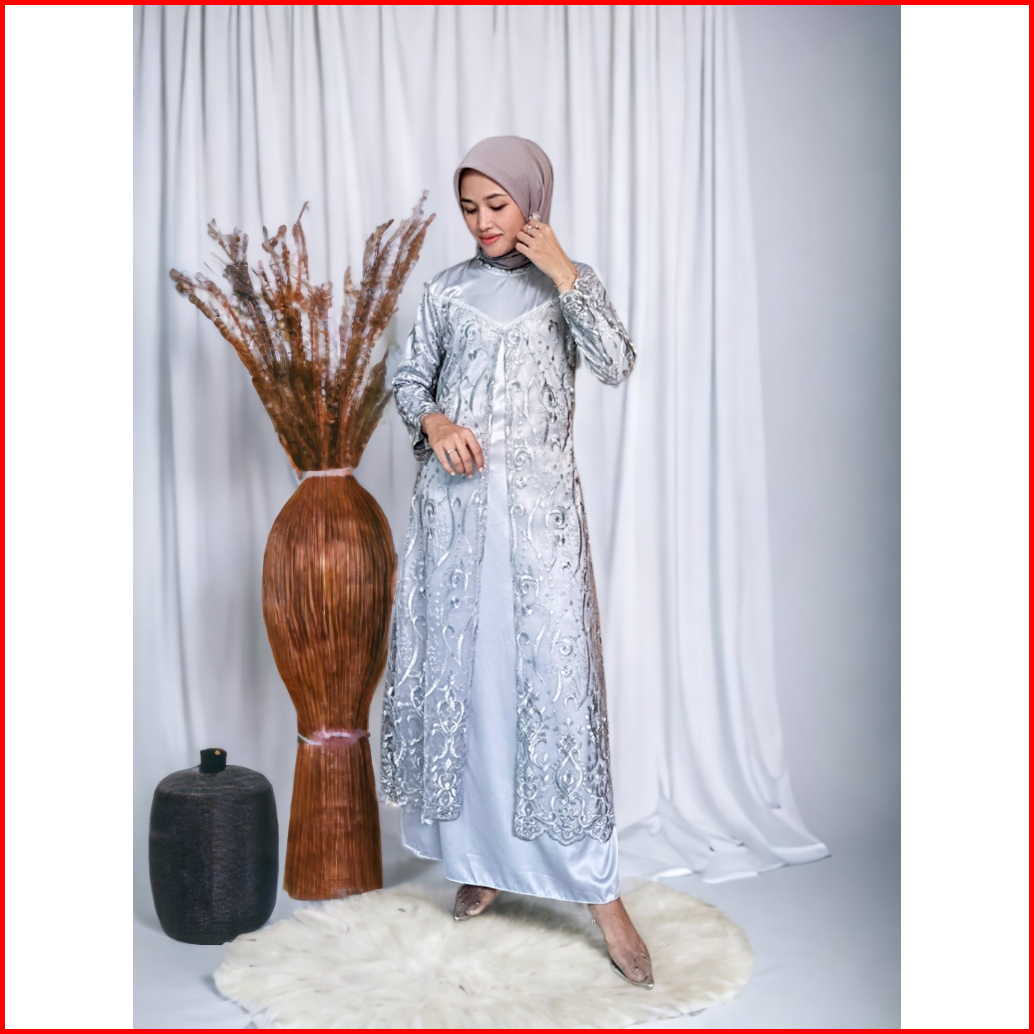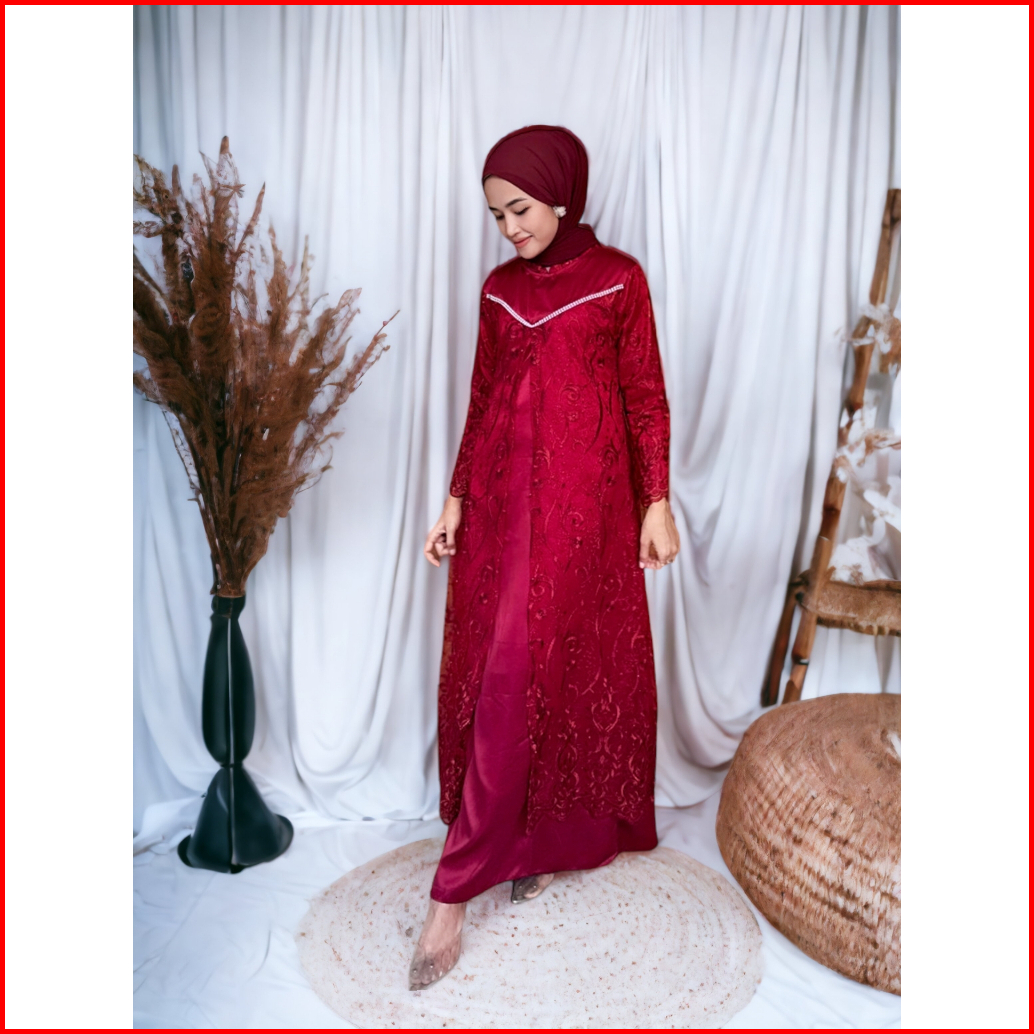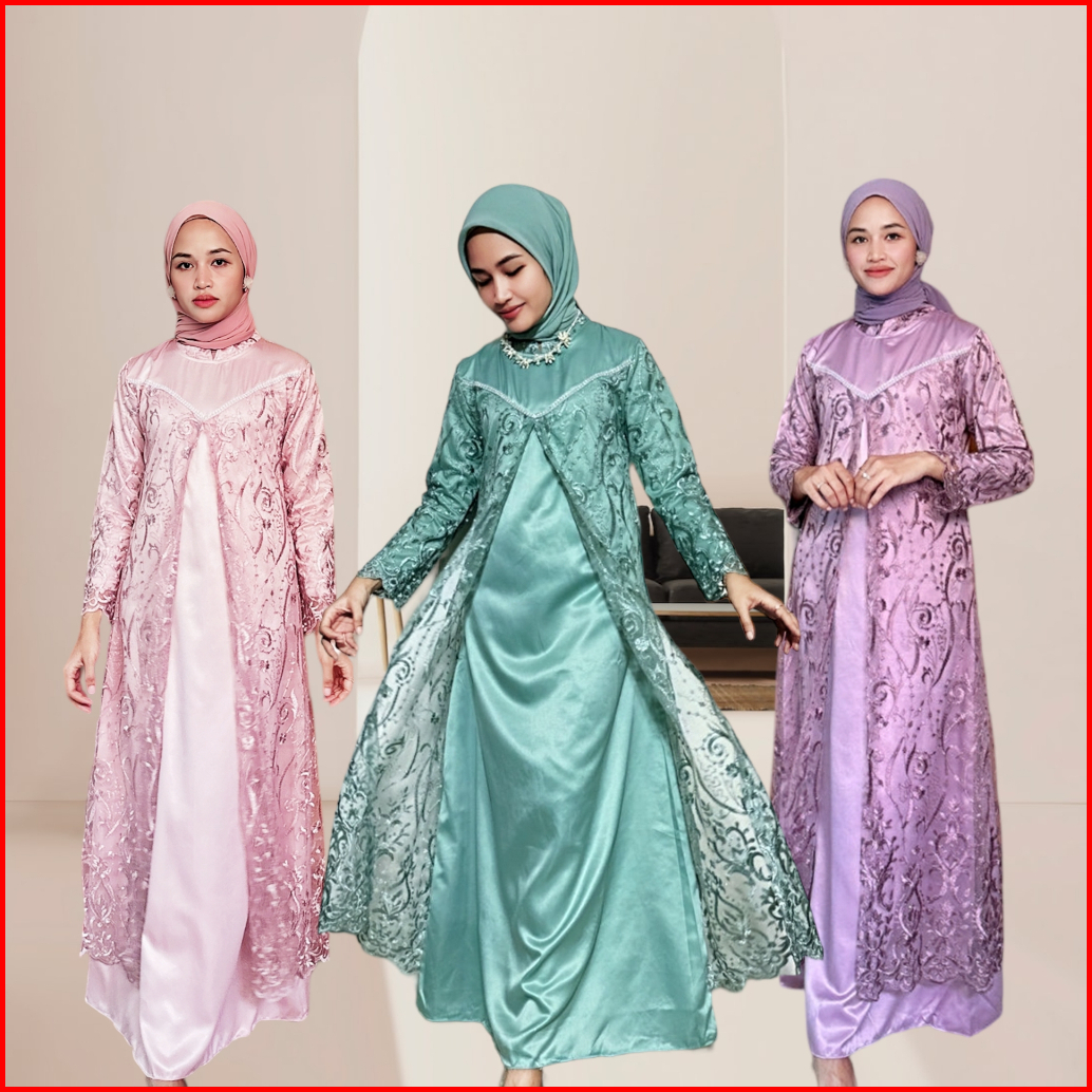 Septiana Gamis Pesta Kondangan Brukat Tille Mutiara Lapisan Satin Maxi Dress Pesta Kerah Shanghai Brokat Terbaru Mewah