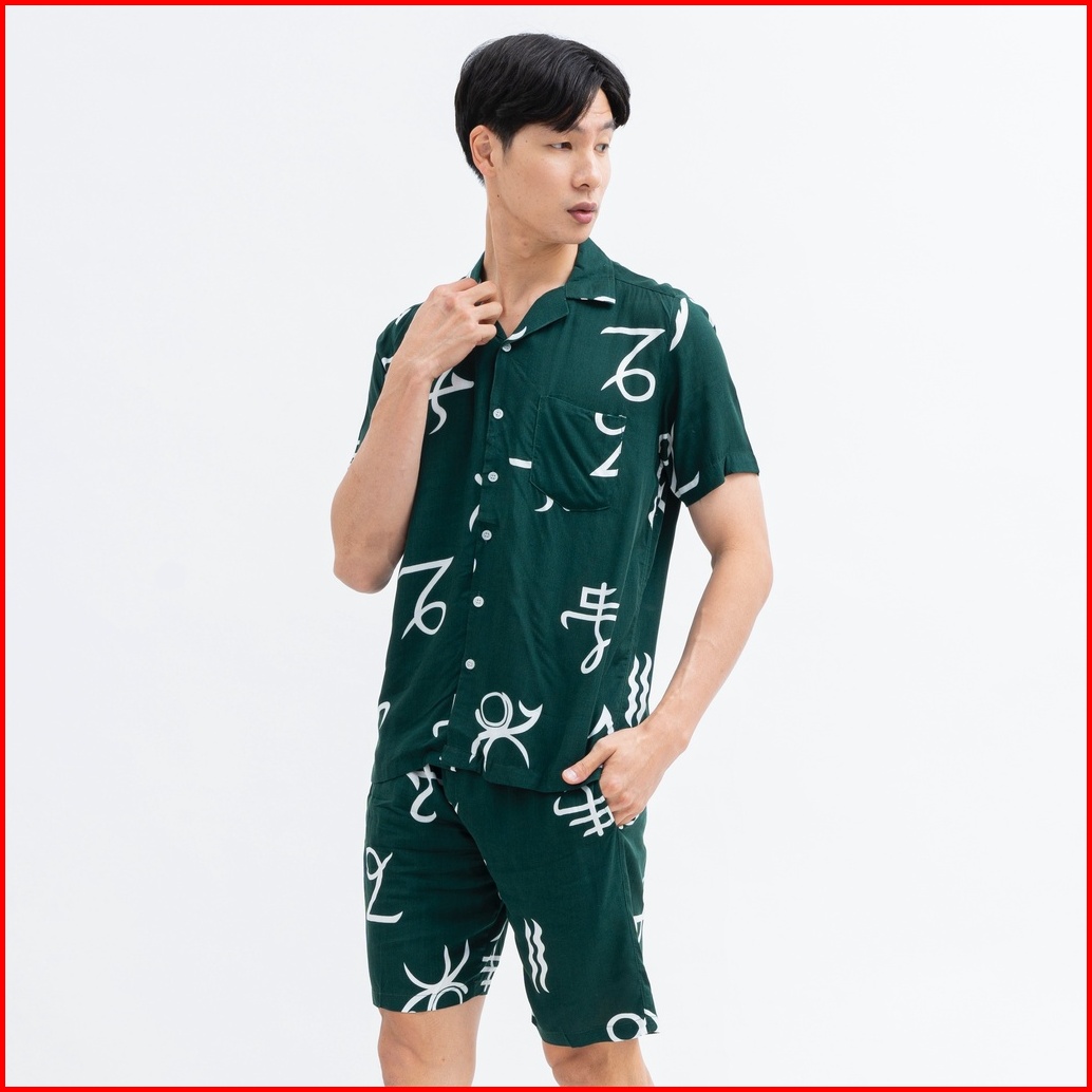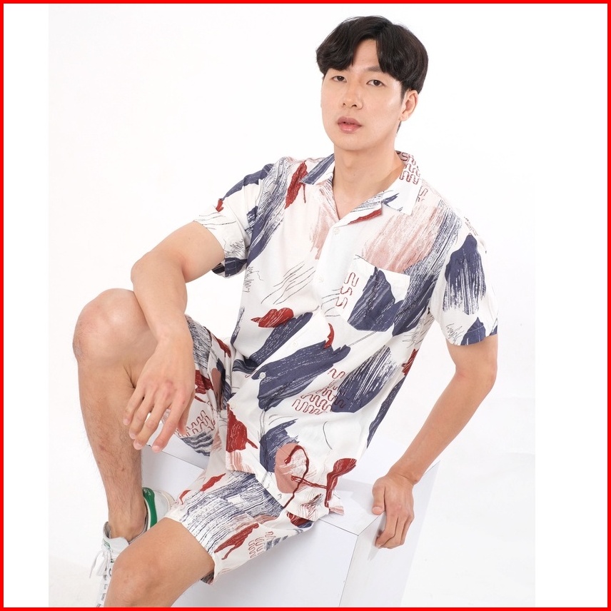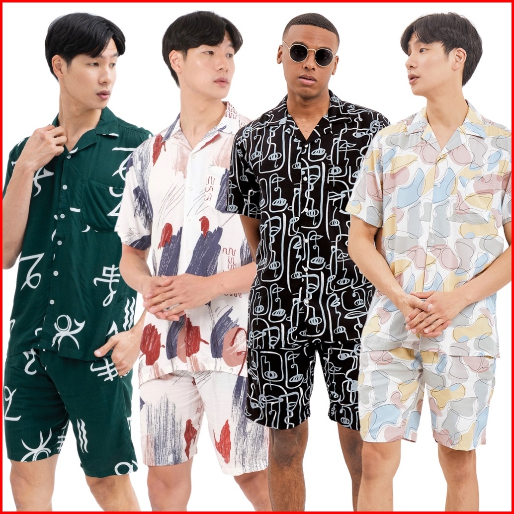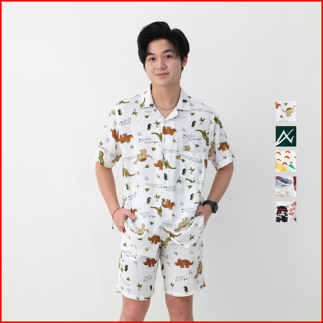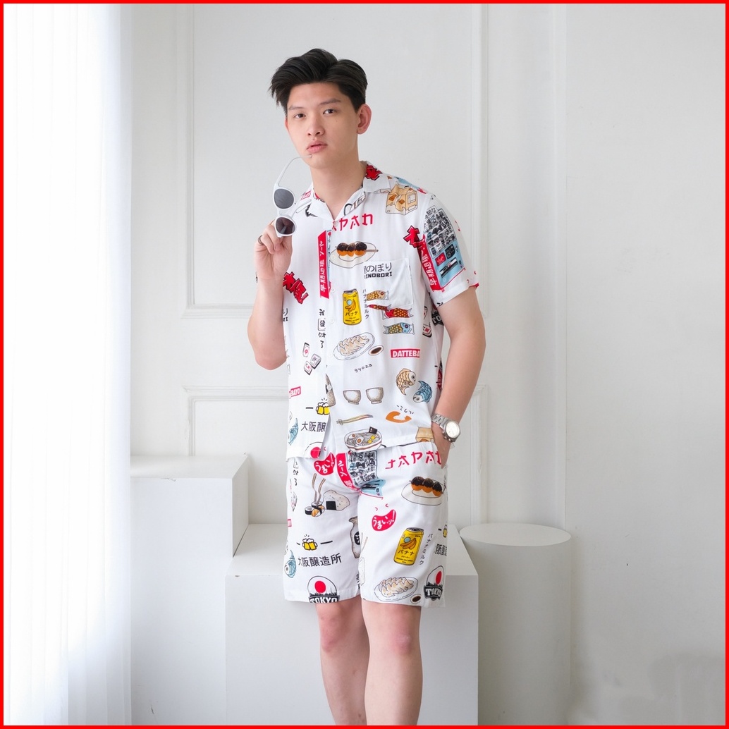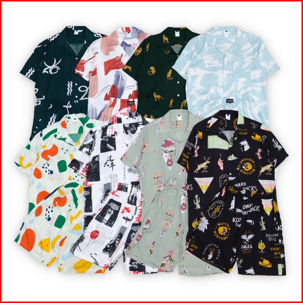 Sanvanina Set Kemeja Hawaiian Printing Kemeja Oneset Pajamas Pria Oneset Rayon Hawaian Set