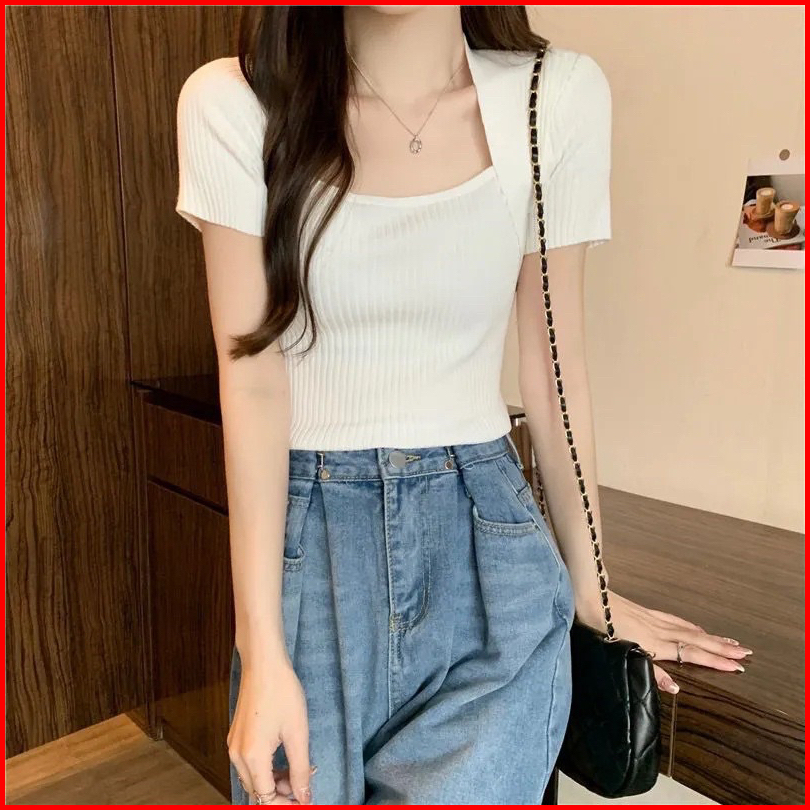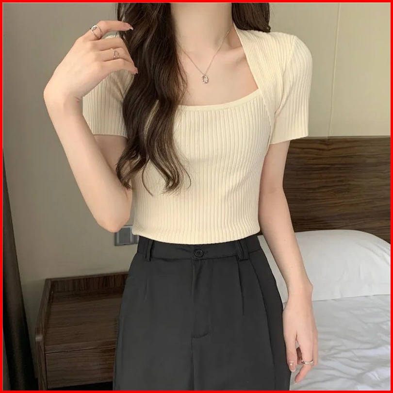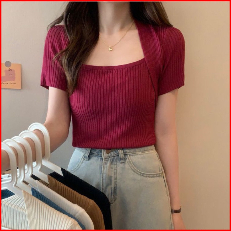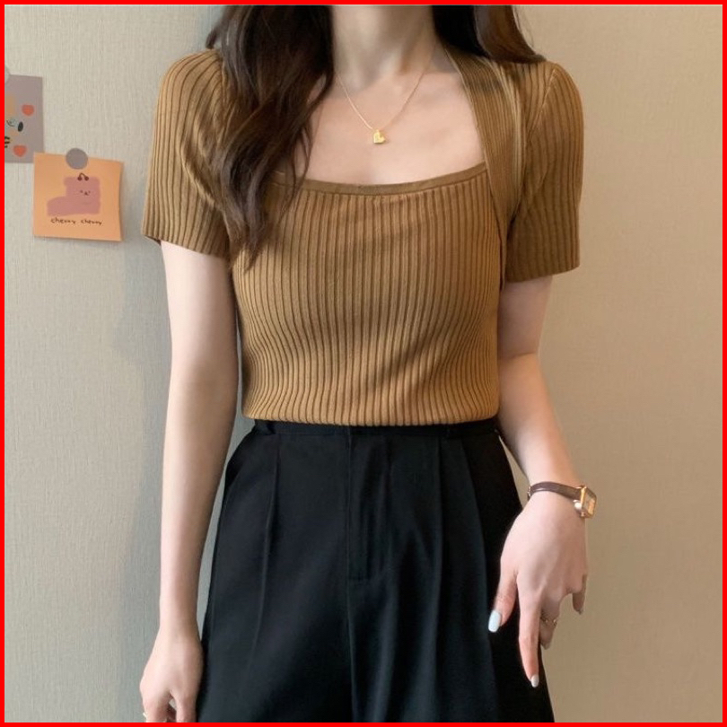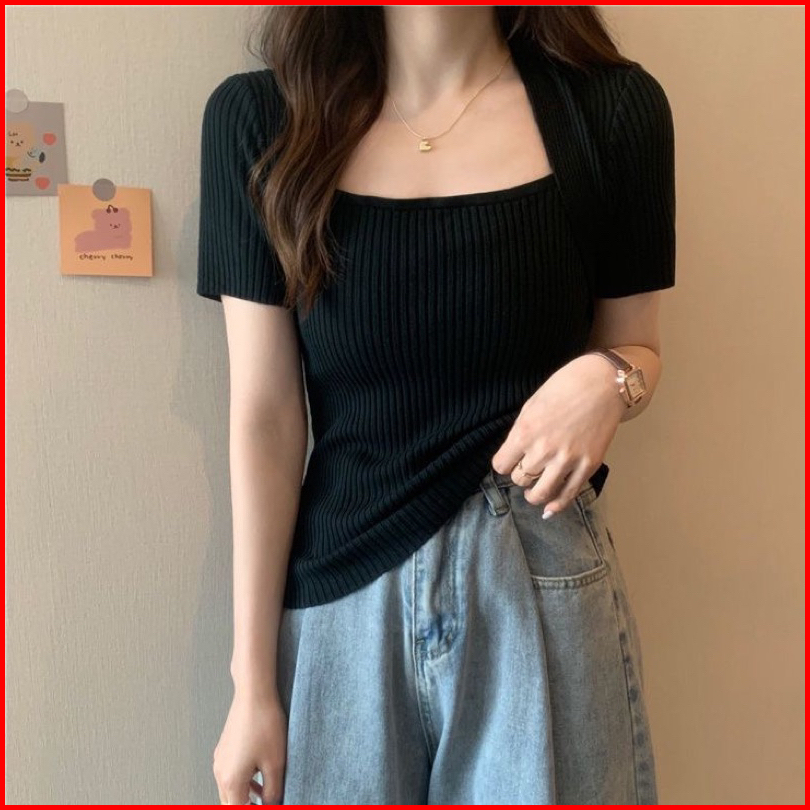 Atasan Rajut Lengan Pendek Wanita Square Neck Korea Style - Tshirt Rajut Lengan Pendek