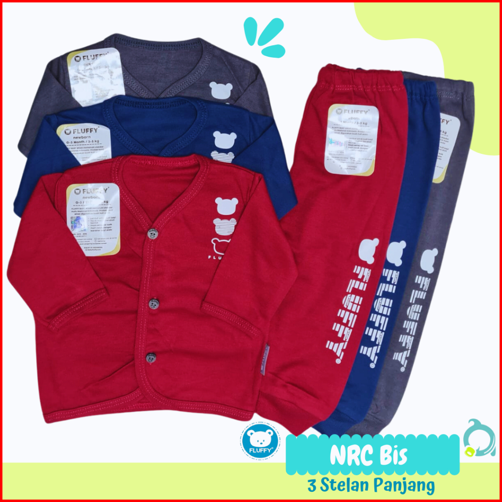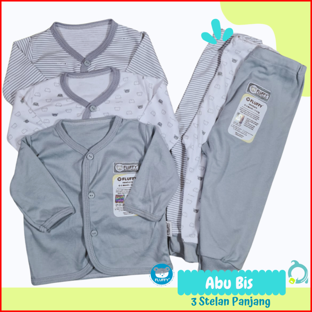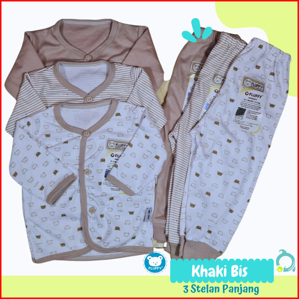 Fluffy 3 Stelan Panjang Bis Motif Mix Abu Khaki Pink Biru Size 0-3 Bulan Newborn