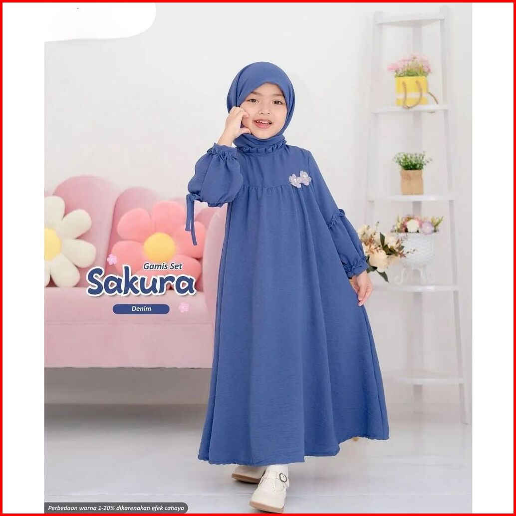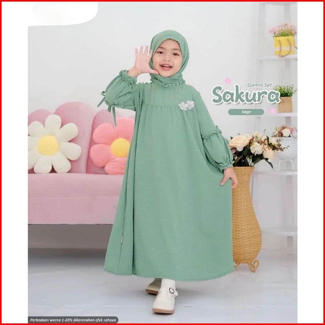 Baju Muslim Anak Perempuan Sakura Set Polos Usia 3 - 11 Tahun Size M L Xl Xxl Bahan Crinkle Airflow Gamis Kids Kekinian