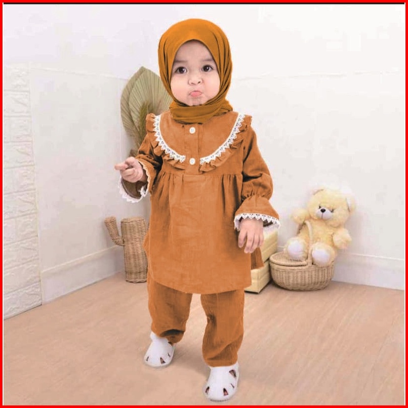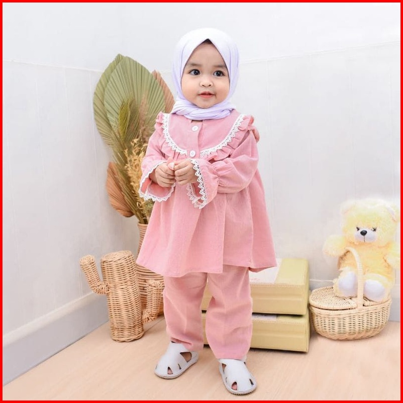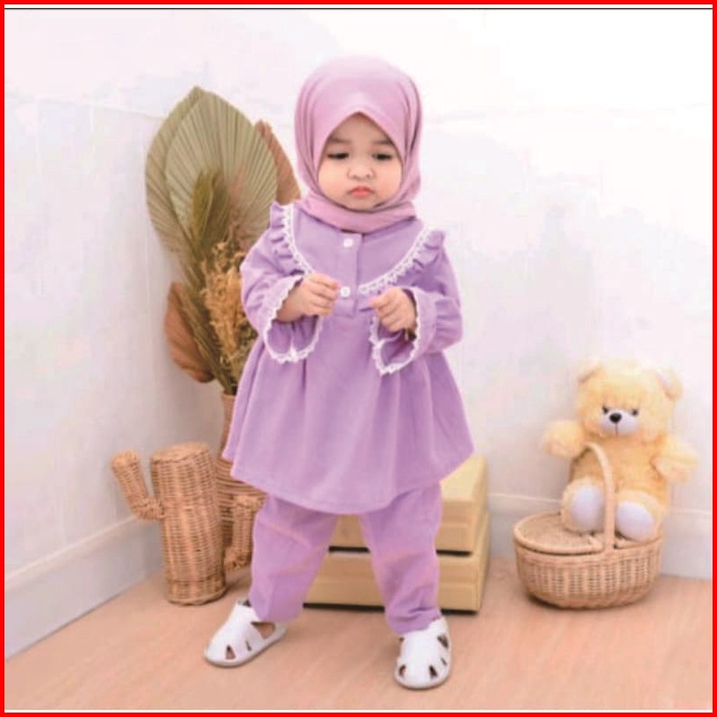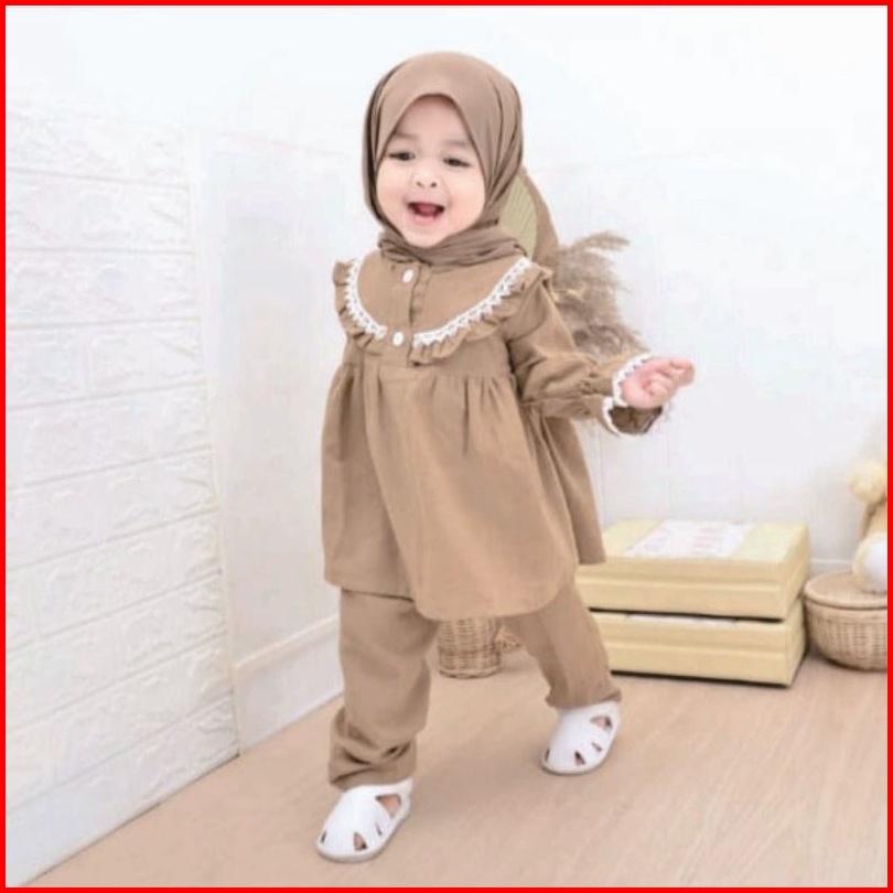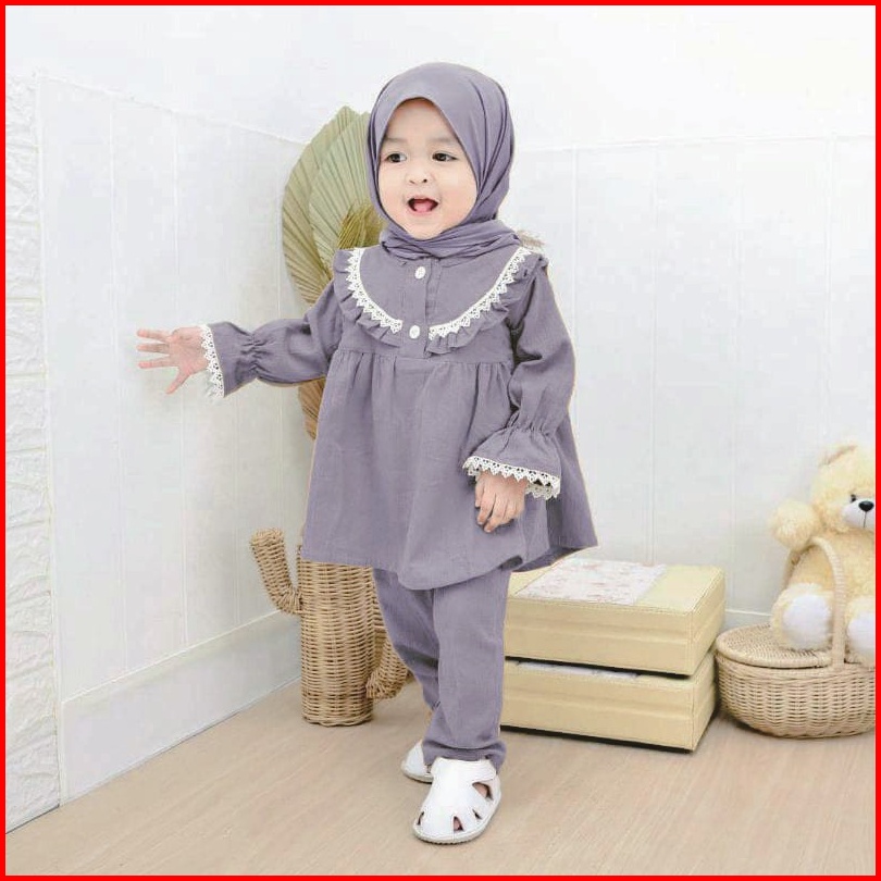 Setelan Muslim Anak Perempuan Usia 1-6 Tahun Motif Polos One Set Tali Belakang