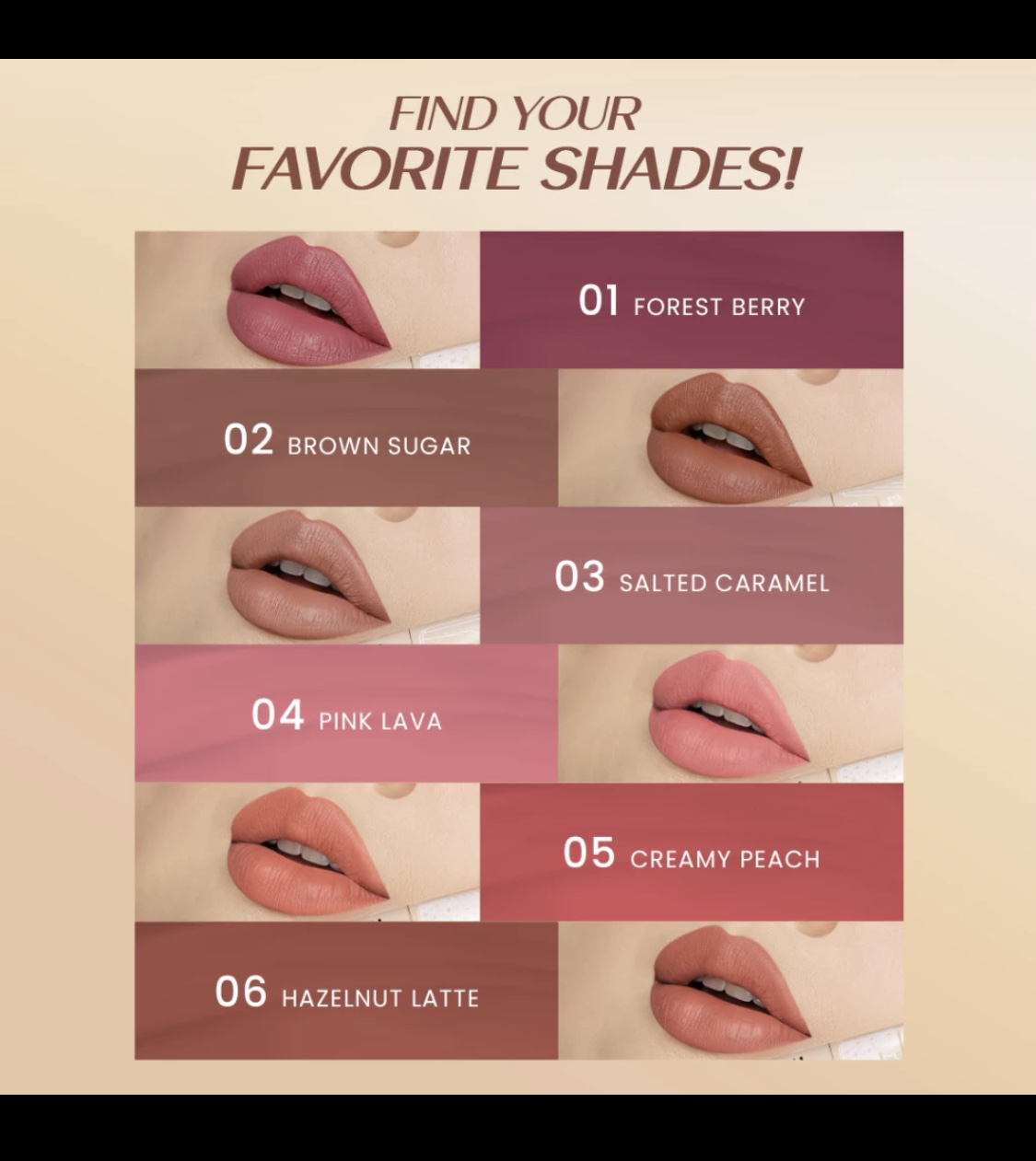01 FOREST BERRY, 02 BROWN SUGAR, 03 SALTED CARAMEL, 04 PINK LAVA, 05 CREAMY PEACH, 06 HAZELNUT LATE