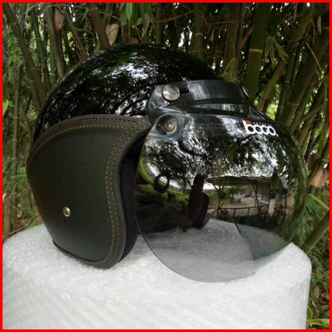 Helm Bogo Retro Kulit Dewasa Kaca Bogo Original Kombinasi Kulit Hitam Cat Hitam
