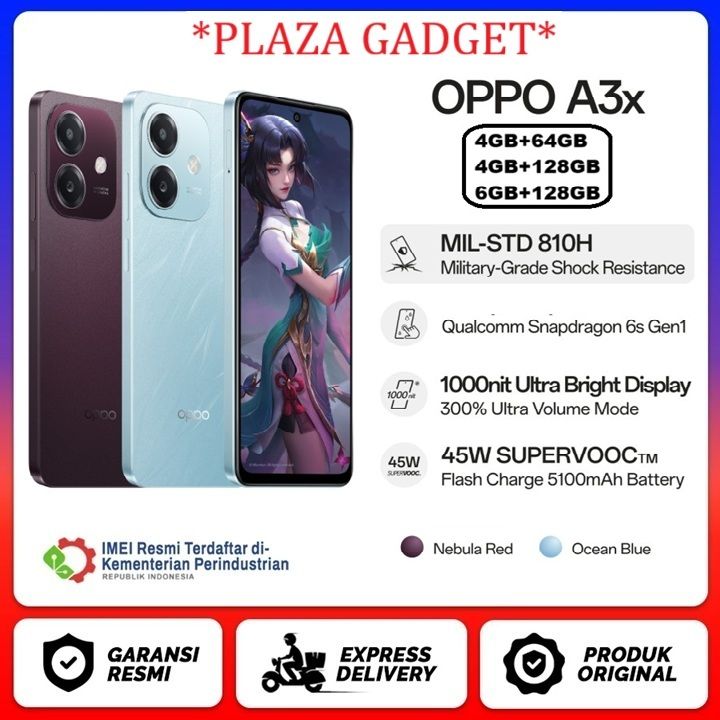 OPPO A3X 4/64GB+4/128GB+6/128GB CHIPSET CPU: Qualcomm® Snapdragon® 6s 4G Gen1 SUPERVOOCTM 2.0, 45W (11V/4.1A)