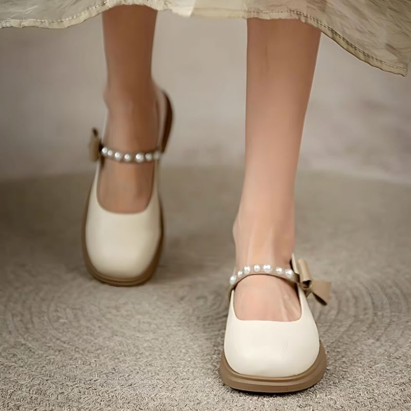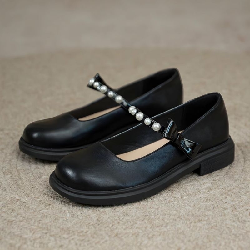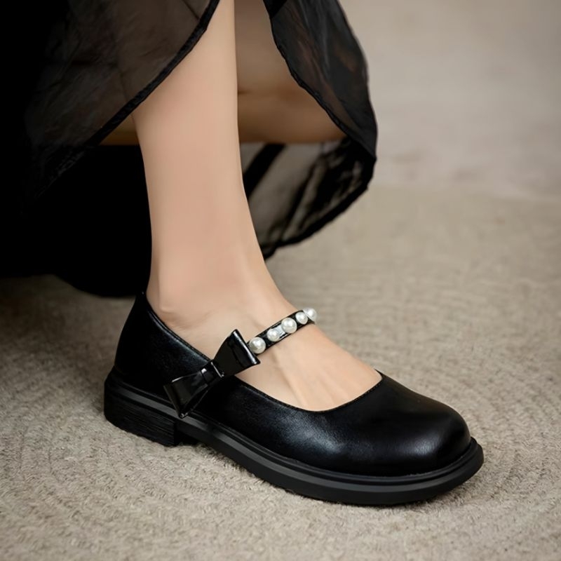 Sepatu Docmart Wanita Hitam Gesper Mutiara Hak Datar Kasual Premium DF 566 Sepatu Flat Loafers Kulit Cewek Kekinian