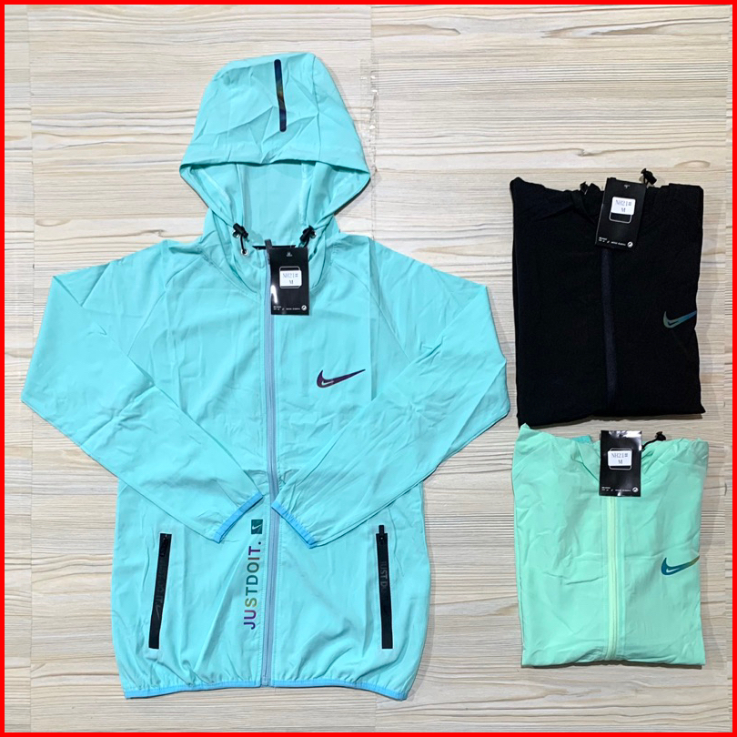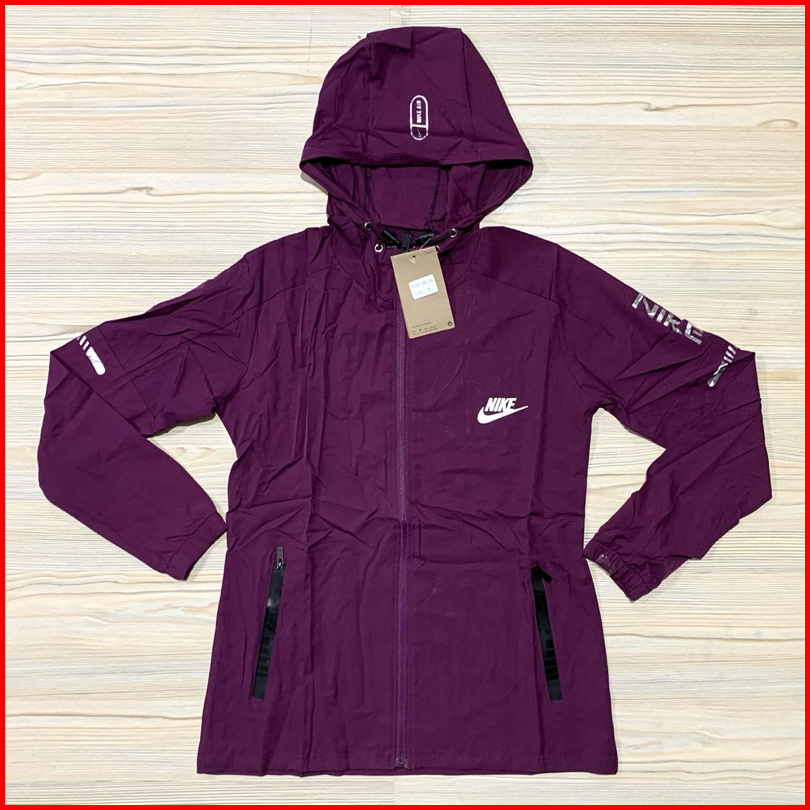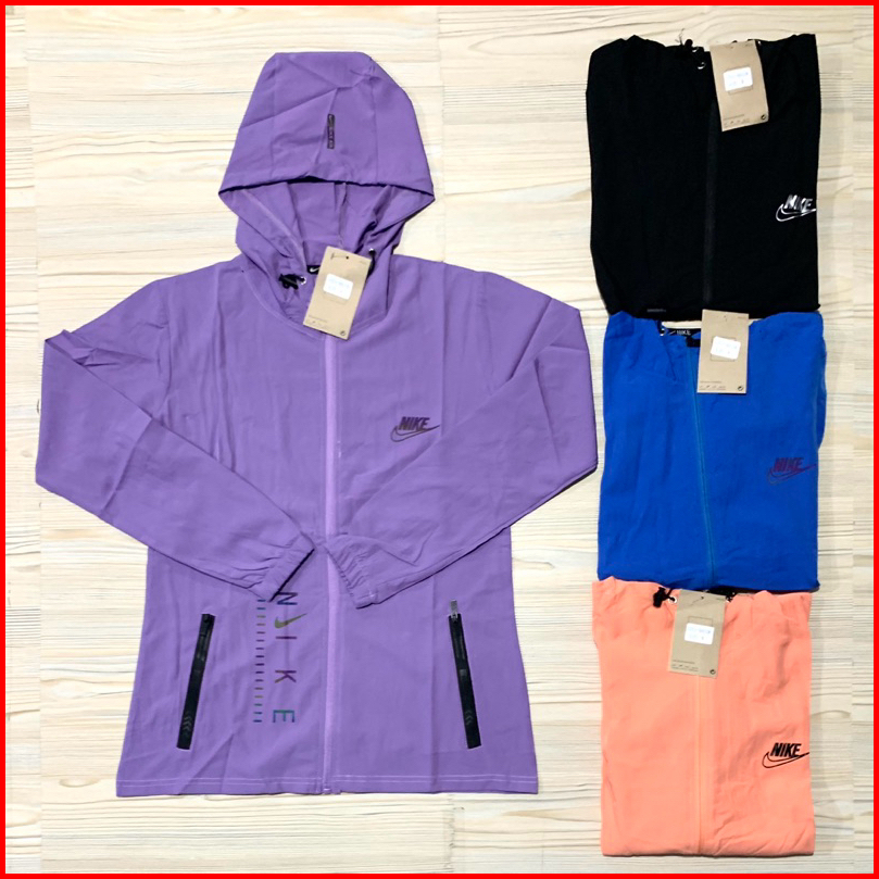 Jaket Micro Wanita N1ke Ladies Ungu Hitam Biru Peach Oren Lengan Panjang Topi Kupluk Import Running Pastel Biru Muda Hit