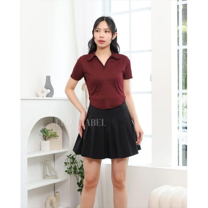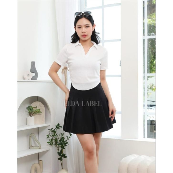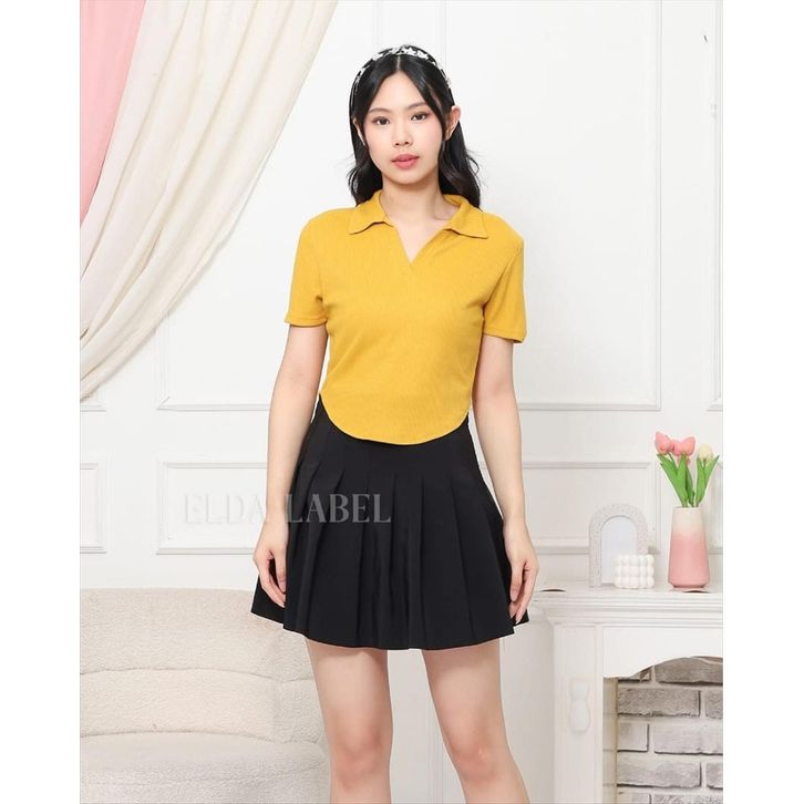 Elda Label Crop Top V Neck Oval Kekinian Lengan Pendek Wanita RIB PREMIUM