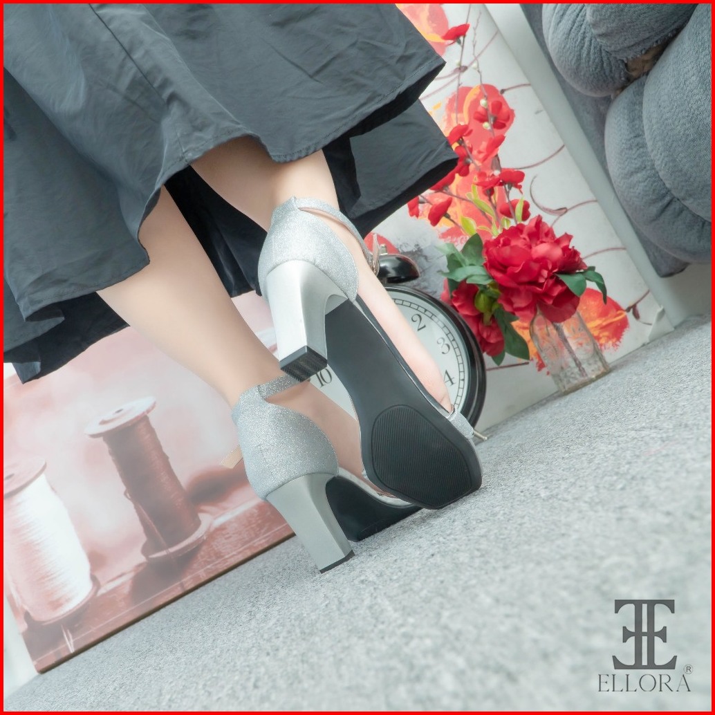 Ellora Es-8254 Sepatu Heels Pesta Wanita 7.5cm Ankle Strap Bahan Kanvas Glitter Import