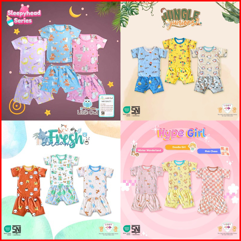 3 Pcs Libby Little Owl Setelan Pendek Oblong Sml Baju Bayi Kacing Pundak Piyama Baby Pendek