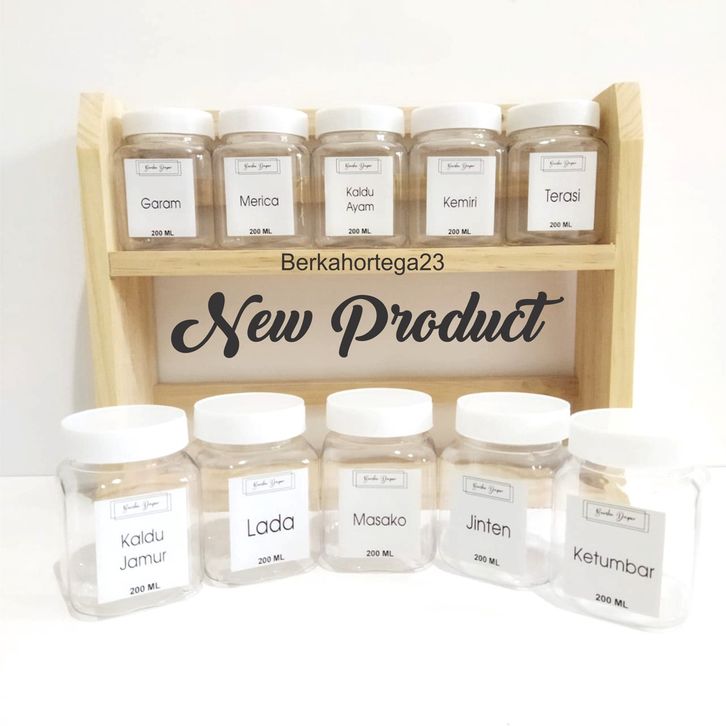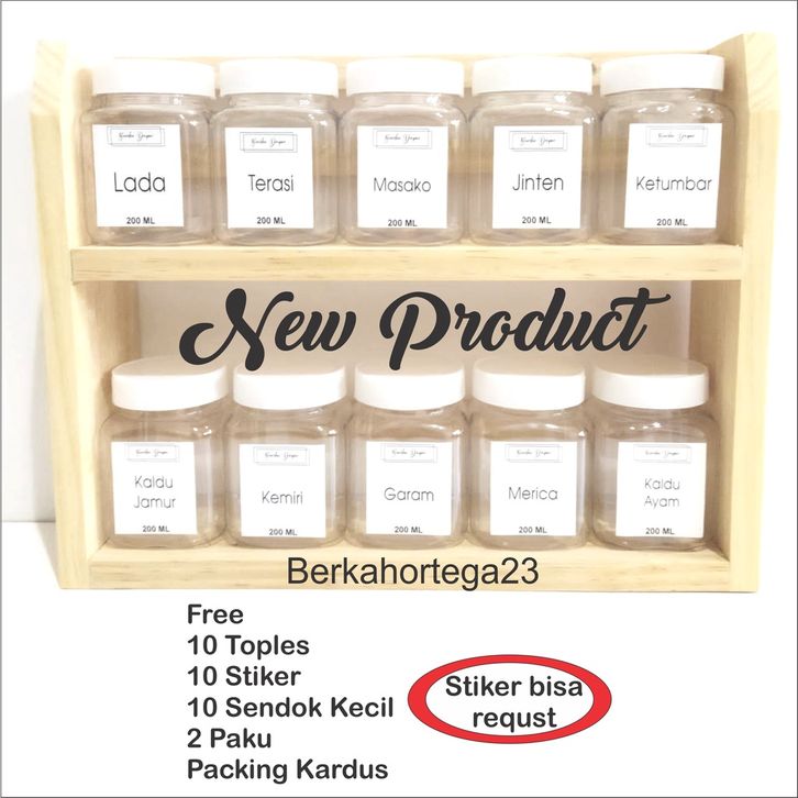 Tempat Bumbu Kayu 2 susun 10 toples dan 10 stiker bumbu