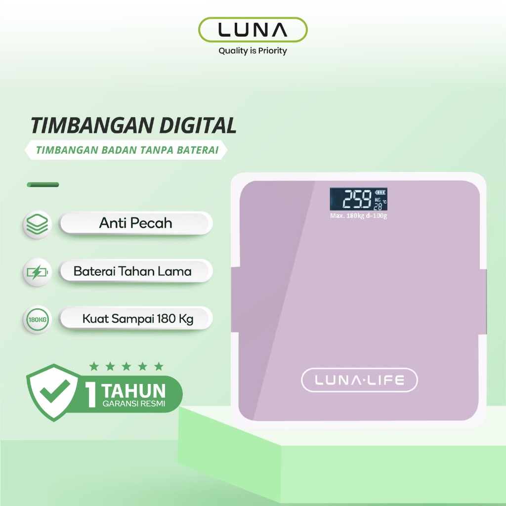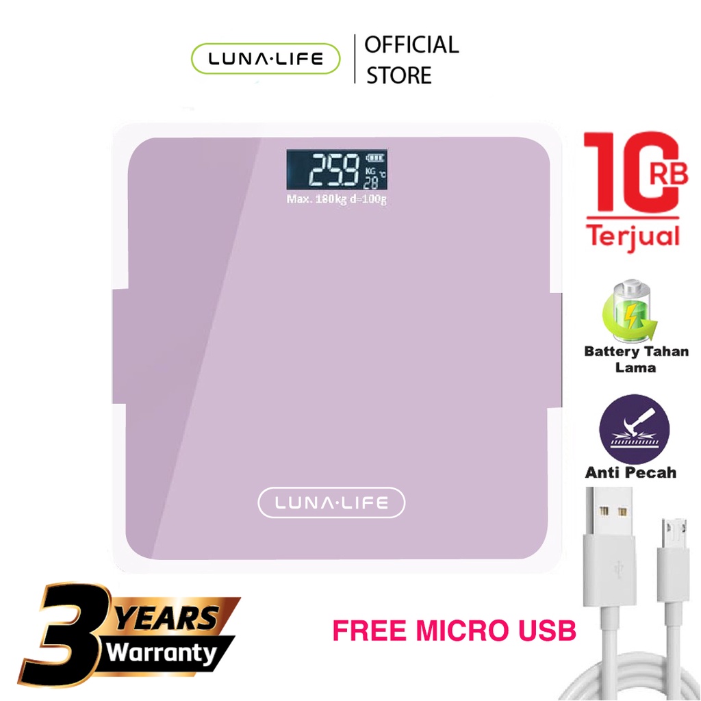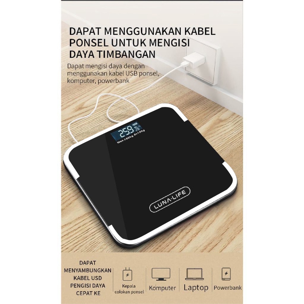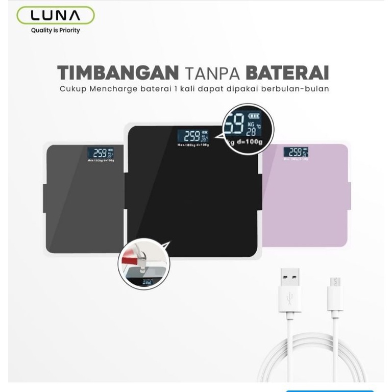 Luna Timbangan Badan Digital With USB Charging Anti Pecah With LCD GARANSI 3 TAHUN Official