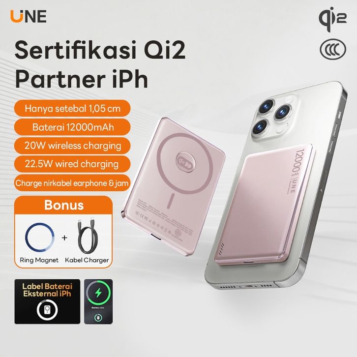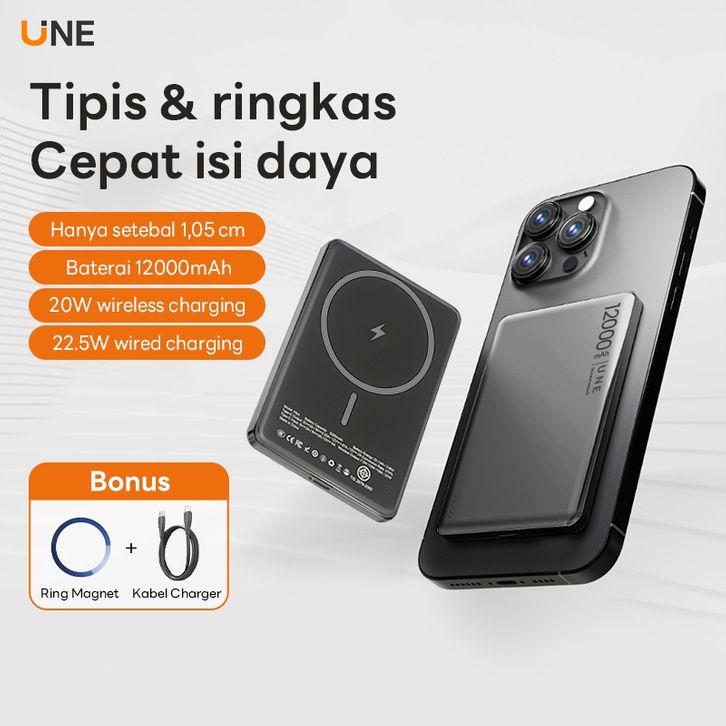 UNE 12000mah Powerbank Wireless Magnetic Qi2 PD20W Mini Fast Charging 2-in-1 Power Bank with Type C