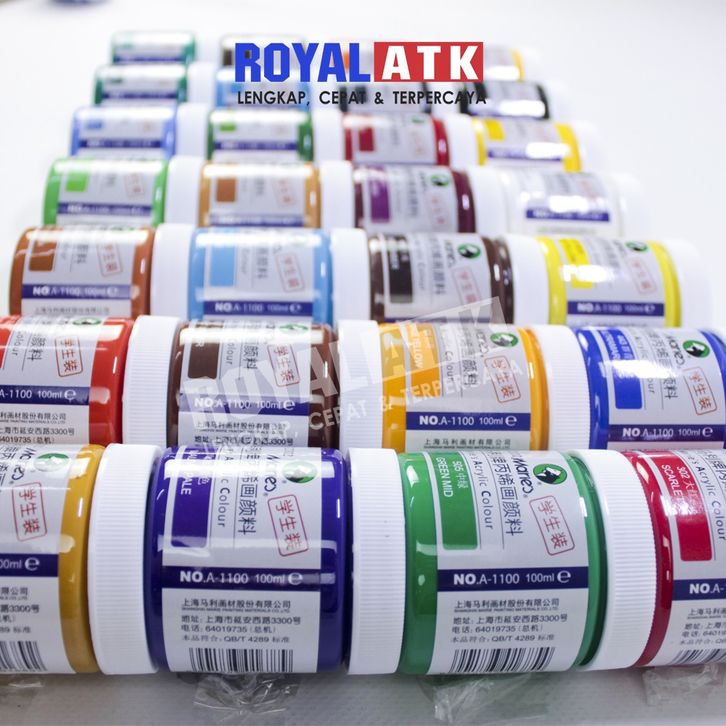Black, Burnt Sienna, Burnt Umber, Cerulean Blue, Cobalt Blue, Crimson, Green Mid, Green Pale, Lemon Yellow, Mauve Pale, Orange Red, Orange Yellow, Paynes Grey, Phtalo Blue, Phtalo Green, Purple Red, Raw Sienna, Raw Umber, Sap Green, Scarlet, Sky Blue, Titanium White, Ultramarine, Vandyke Brown, Vermilion, Viridian, Yellow Mid, Yellow Ochre, Yellow Pale
