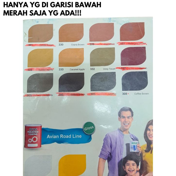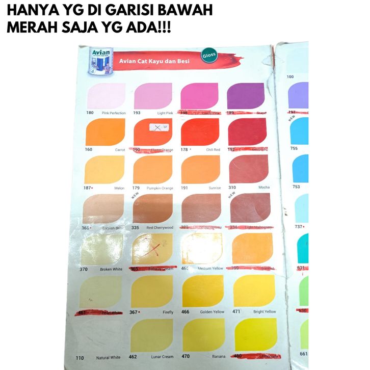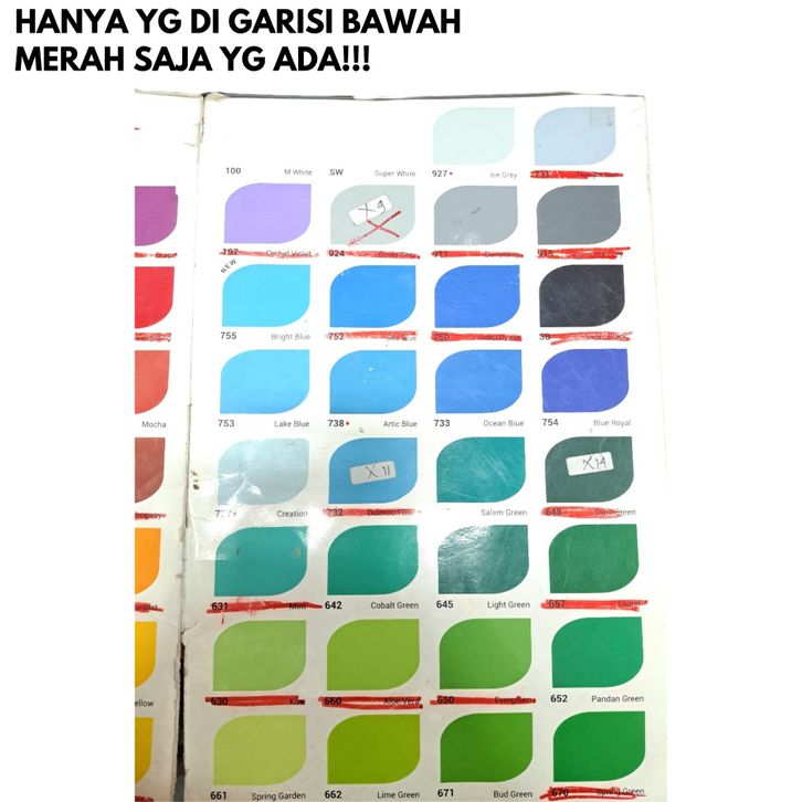 ALOEVERA 660, BRIGHT BLUE 755, CANDY BROWN 301, CANDY PINK 198, CINNAMON 309, DARK GREY 915, DEEP OCEAN 750, DOVE GREY 911, EVERGREEN 650, FLAME ORANGE 190, GOLDEN BROWN 329, GOLDEN HONEY 328, GRAPE 189, HITAM DOP, KIWI 630, LAUREL 657, LEMONADE 480, LIGHT MAHOGANY 334, MAHOGANY BROWN 331, MAROON 194, MINT 631, OCEAN BLUE 733, ORCHID VIOLET 197, PEARLY WHITE 461, PUTIH DOP, SADDLE BROWN 306, SEA BLUE 752, SPRING GREEN 607, SUEDE 303, SUNKIST 199, SUPER BLACK, SUPER WHITE, TWILIGHT BLUE 731, VERMILLION 912