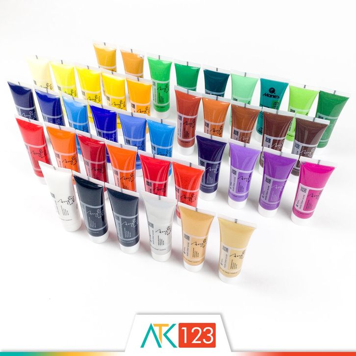 Black, Brilliant Purple, Burnt Sienna, Burnt Umber, Cerulean Blue, Cobalt Blue, Crimson, Dioxazine Violet, Emerald Green, Gold, Green Mid, Green Pale, Lemon Yellow, Light Red, Naples Yellow, Orange Red, Orange Yellow, Pale Gold, Payne's Grey, Permanent Orange, Permanent Red, Phthalo Blue, Phthalo Green, Prussian Blue, Purple Pale, Raw Sienna, Raw Umber, Rose, Sap Green, Scarlet, Silver, Sky Blue, Titanium White, Ultramarine Blue, Vandyke Brown, Vermilion, Viridian, Yellow Mid, Yellow Ochre, Yellow Pale, Yellowish Green
