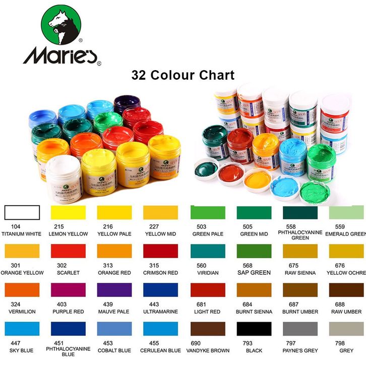 104-Titanium White, 121-Silver (100ml), 132-Gold (100ml), 210-Naples Yellow, 215-Lemon Yellow, 216-Yellow Pale, 219-Potrait Tone, 227-Yellow Mid, 301-Orange Yellow, 302-Scarlett, 313-Orange Red, 315-Crimson Red, 317-Neon Pink, 324-Vermillion, 336-Rose, 339-Pink, 402-Brilliant Blue, 403-Purple Red, 430-Violet, 434-Purple Pale, 439-Mauve Pale, 443-Ultramarine, 445-Prussian Blue, 447-Sky Blue, 451-Pthalo Blue, 453-Cobalt Blue, 455-Cerulean Blue, 477-Light Grey Blue, 503-Green Pale, 505-Green Mid, 558-Pthalo Green, 559-Emerald Green, 560-Viridian, 562-Yellowish Green, 568-Sap Green, 569-Olive Green, 570-Green Deep, 572-Blackish Green, 601-Raw Sienna, 676-Yellow Ochre, 681-Light Red, 684-Burnt Sienna, 687-Burnt Umber, 688-Raw Umber, 690-Vandyke Brown, 793-Black, 797-Paynes Grey, 798-Grey