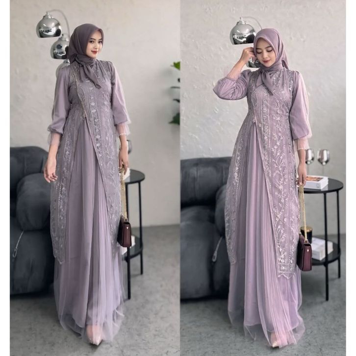 GAMIS KONDANGAN WANITA DRESS SILK KOMBINASI TILE GARDEN PREMIUM WARNA BURGUNDY GAMIS BRUKAT TILE PESTA WANITA MEWAH