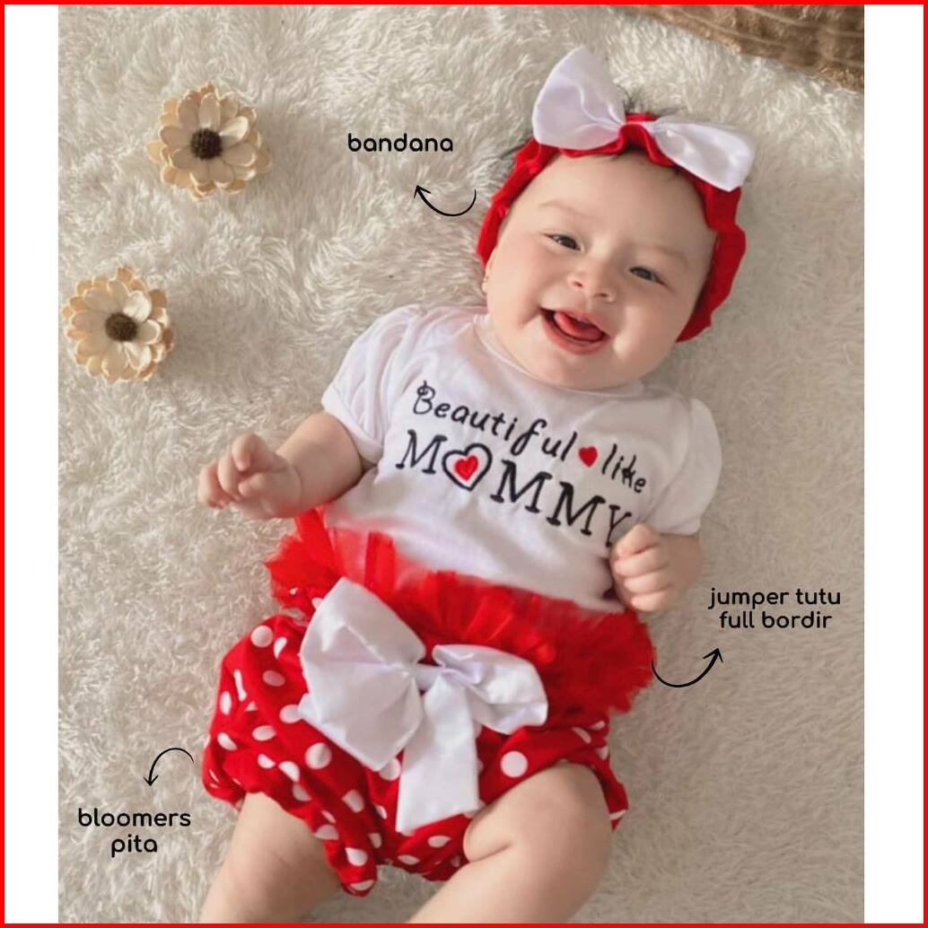 Mommy Little Princess Jumper Tile Newborn Baju Setelan Jumper Rok Bandana Sepatu Pergi Lucu Fashion Anak Bayi Perempuan