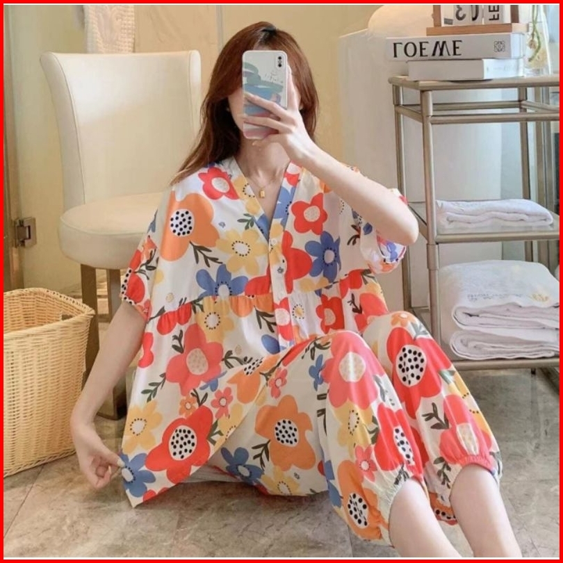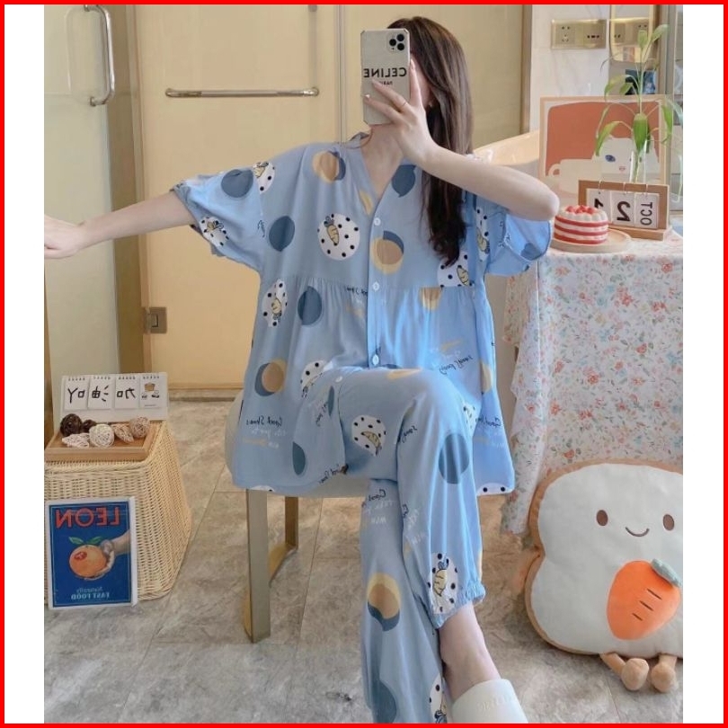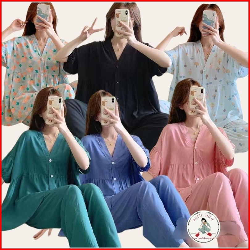 Rulif Baju Tidur Piyama Jumbo Wanita Import Bahan Rayon Katun Premium Full Kancing V Neck Lengan Pendek Celana Panjang K