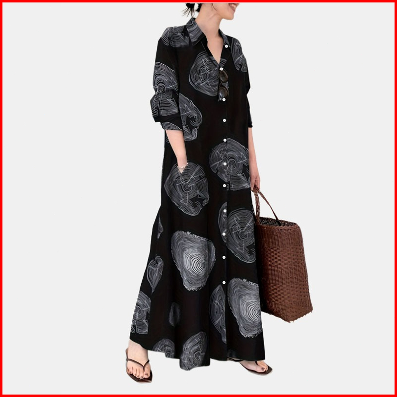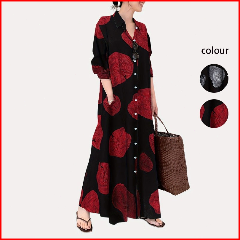 Gdtima Hana Long Dress Korean Style Collar Casual Gaun Motif Lengan Panjang Gamis Kancing Depan