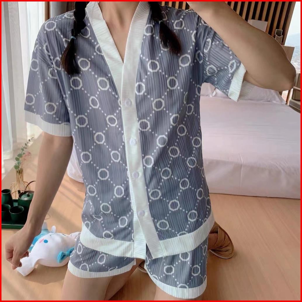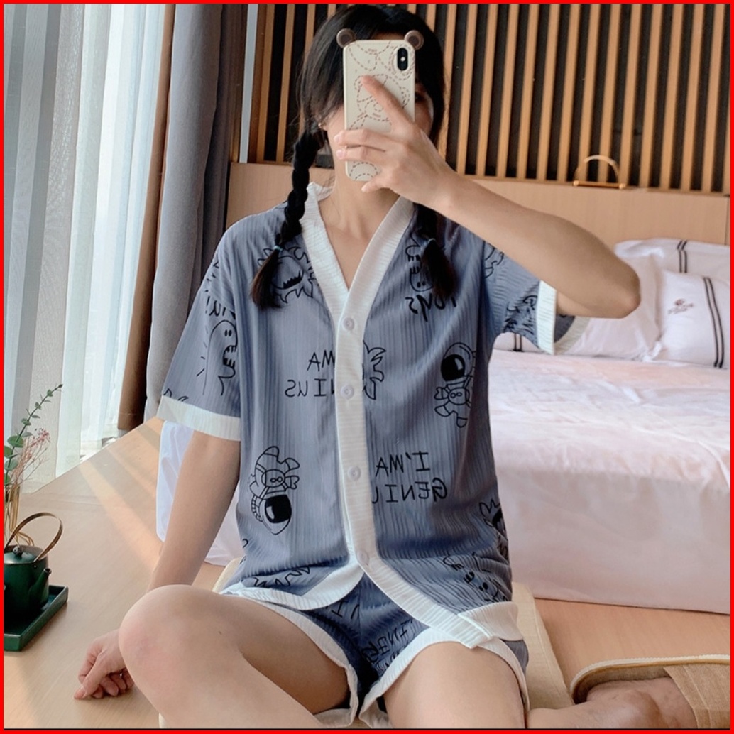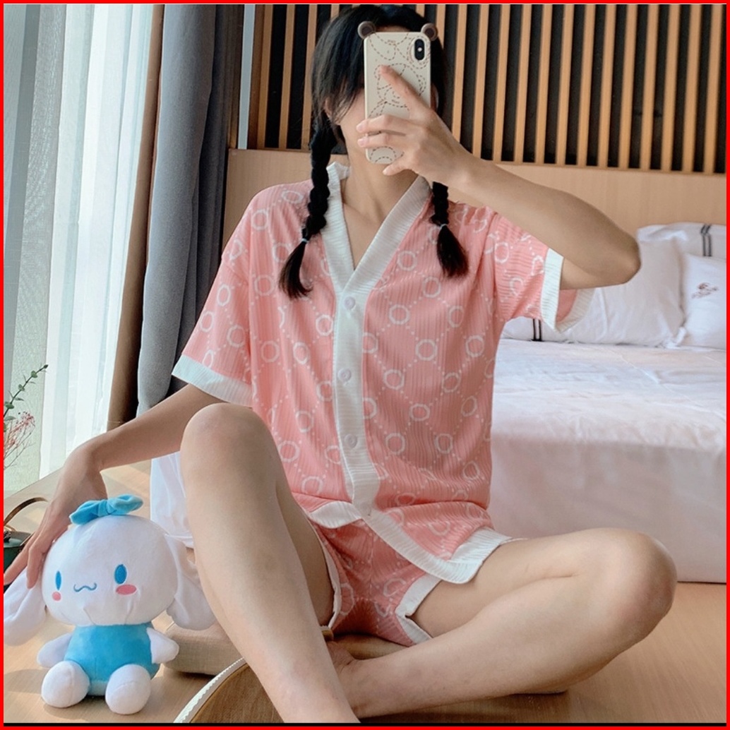Rulif Set Baju Tidur Korea Piyama Pendek Rib Wanita Baju Tidur Import Kancing List
