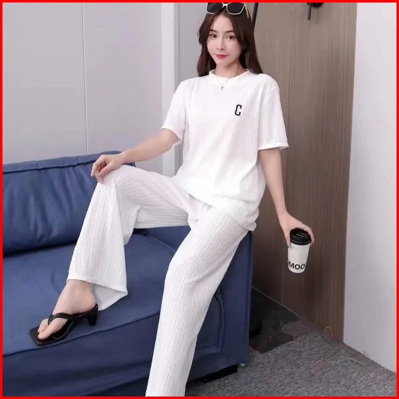 Rulif Oneset Setelan Wanita Whrinkle Set Baju Wanita Lengan Pendek Celana Panjang Cp Import Polos Motif Bordir Logo C Pa