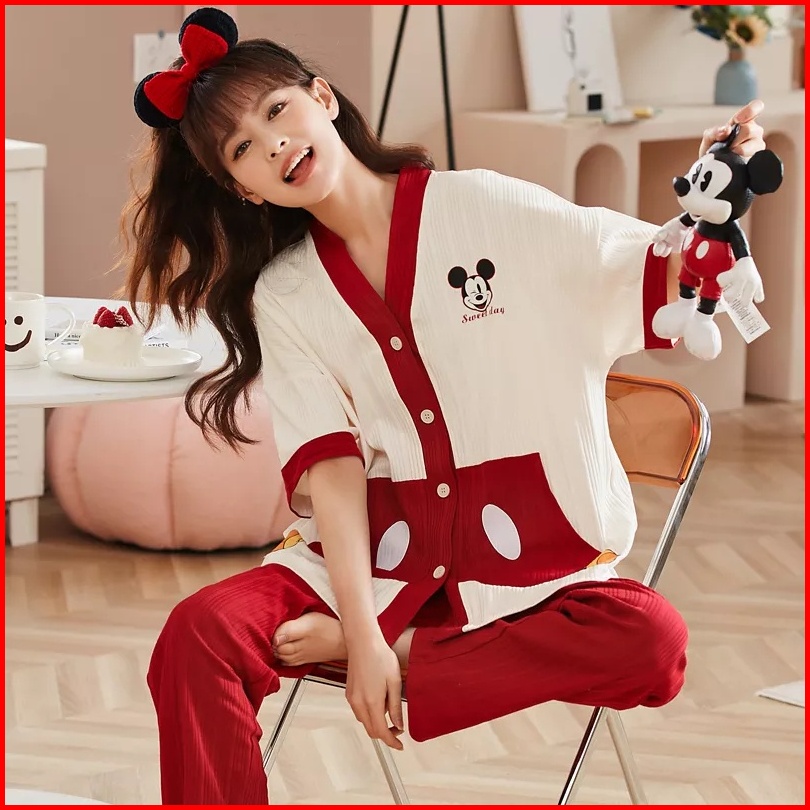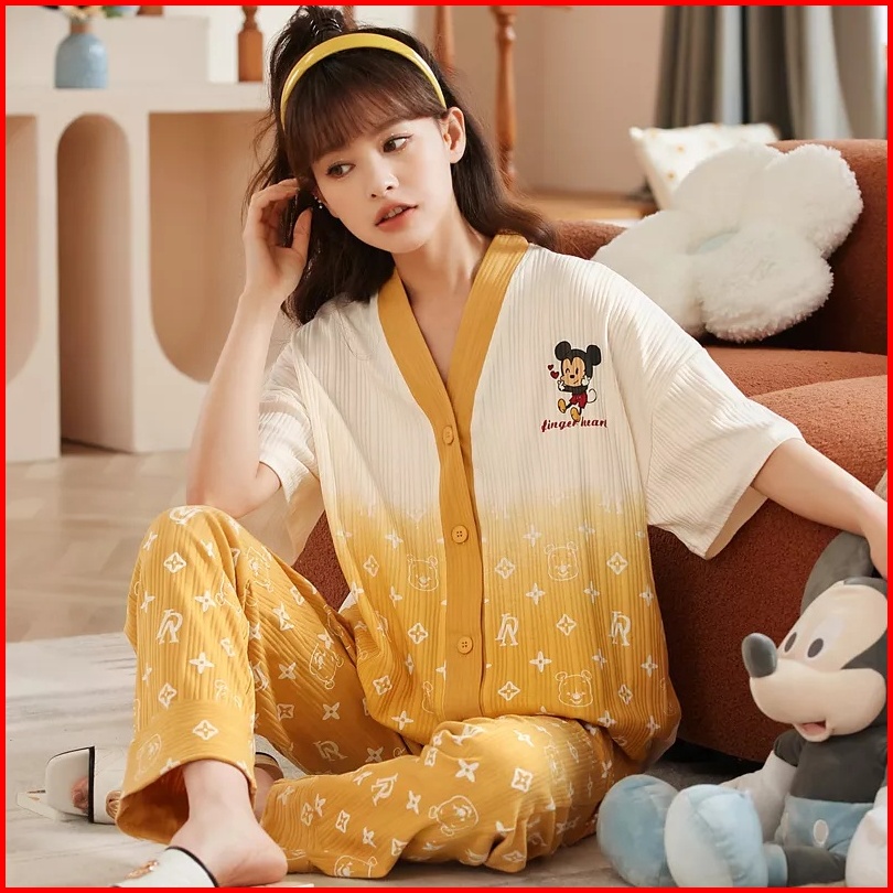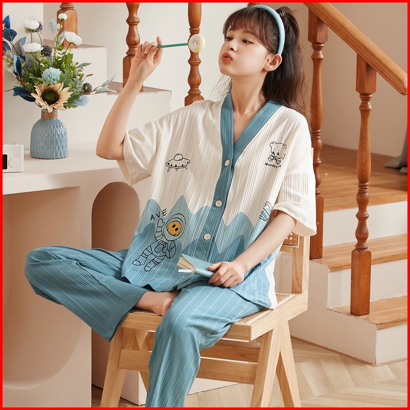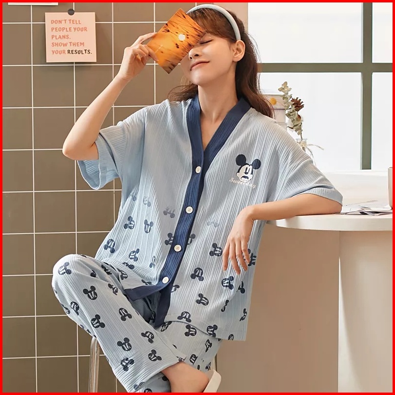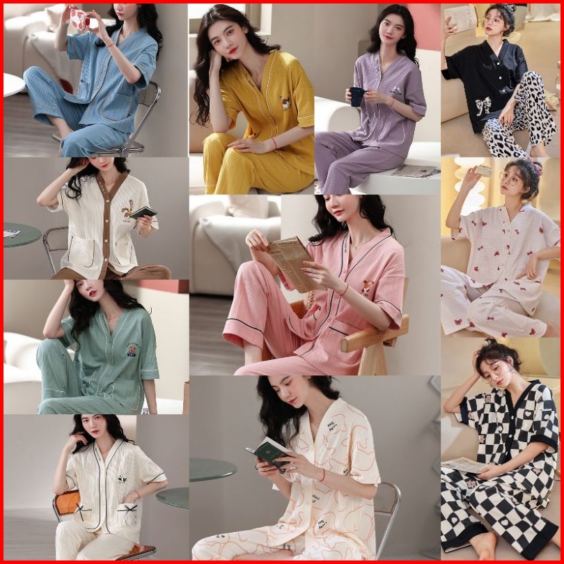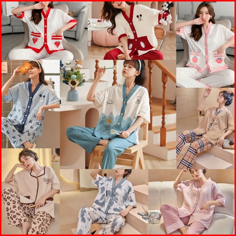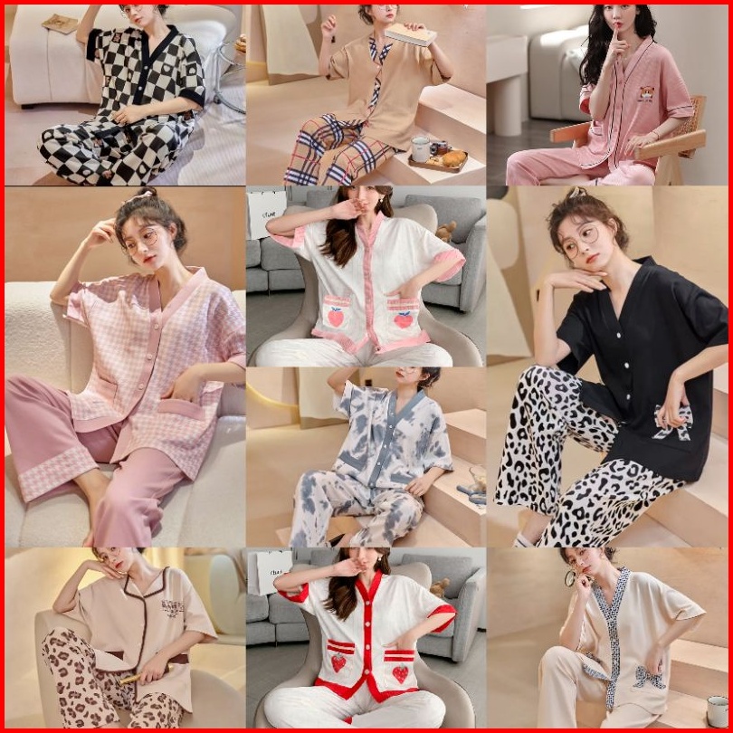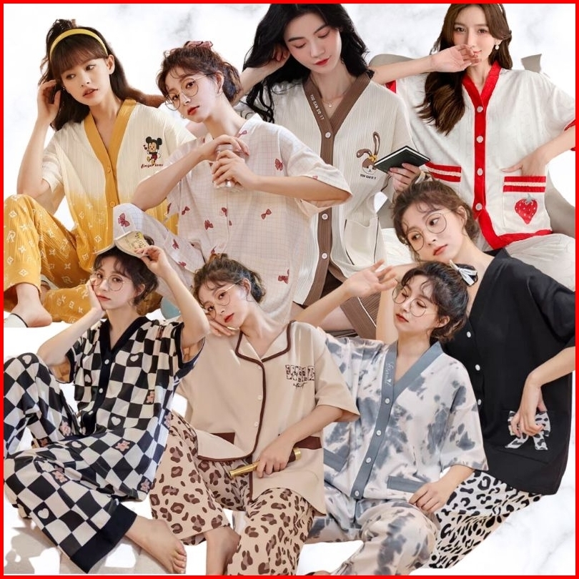 Rulif Set Piyama Wanita Lengan Pendek Baju Tidur Wanita Import Vneck Kancing Piyama Wanita Leisure Oversize