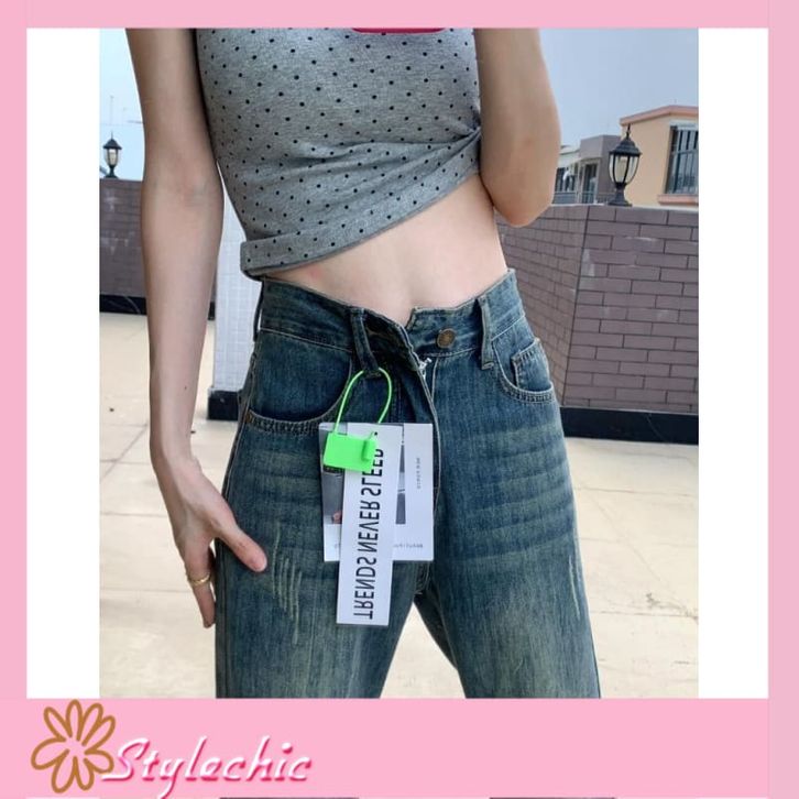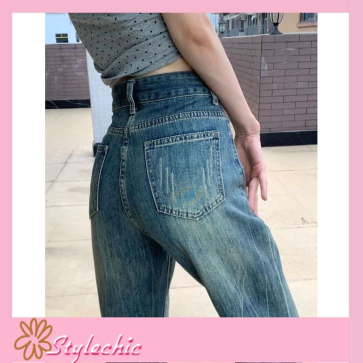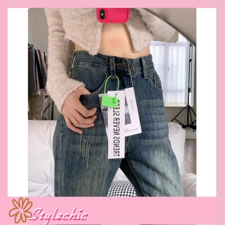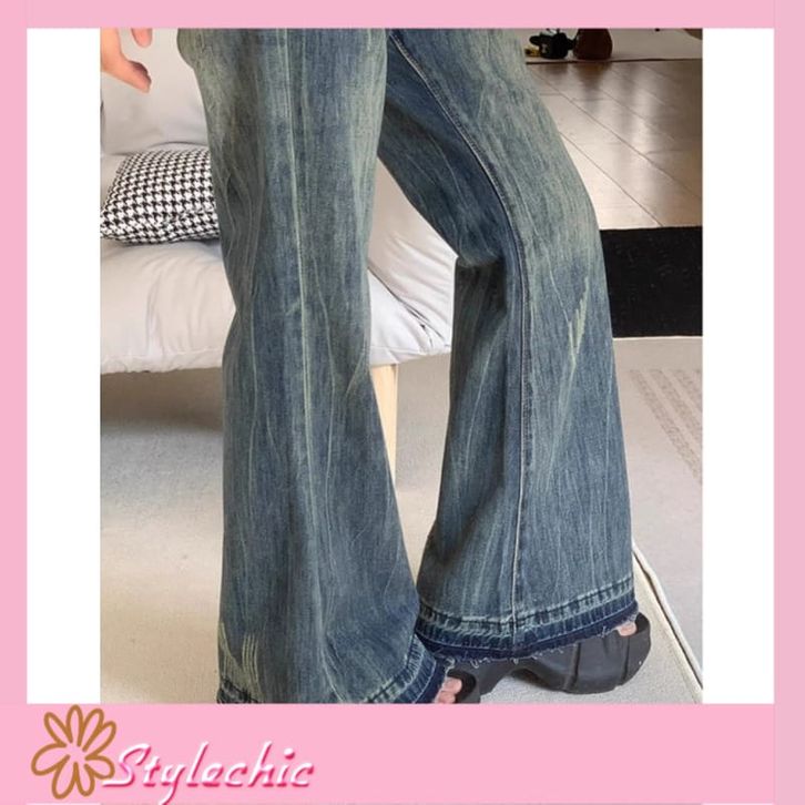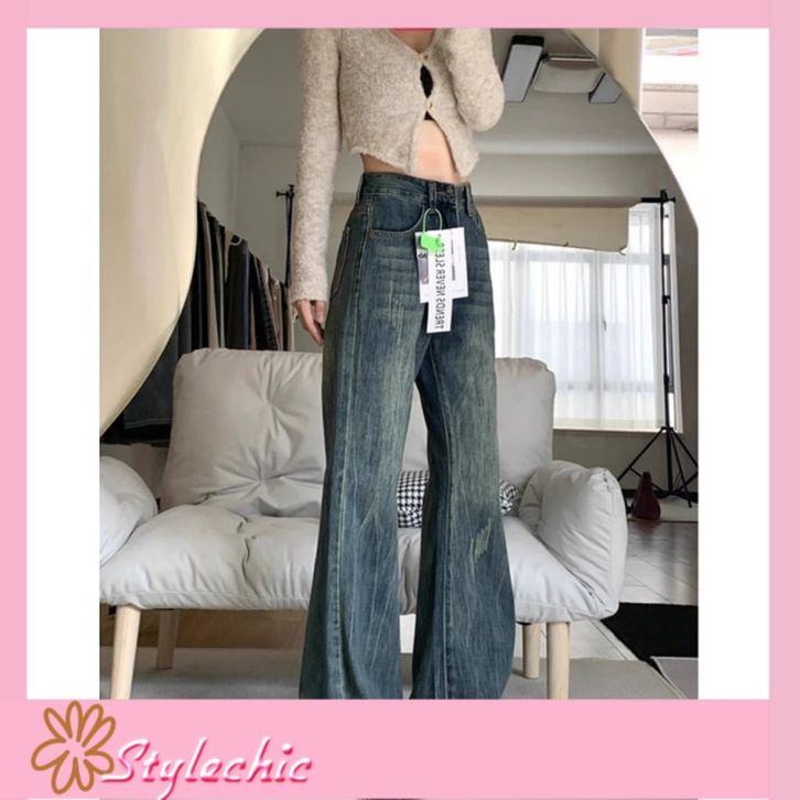 Celana Denim Wanita Panjang Lantai Berkobar Pinggang Tinggi Retro Amerika Celana Jeans Wanita Korean Style Cocok Untuk