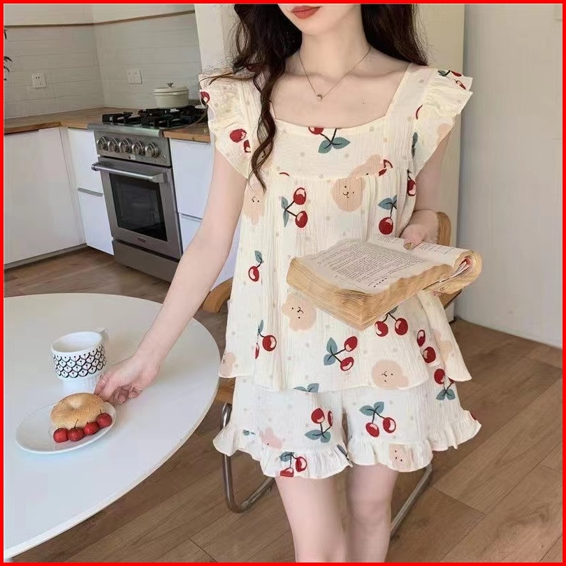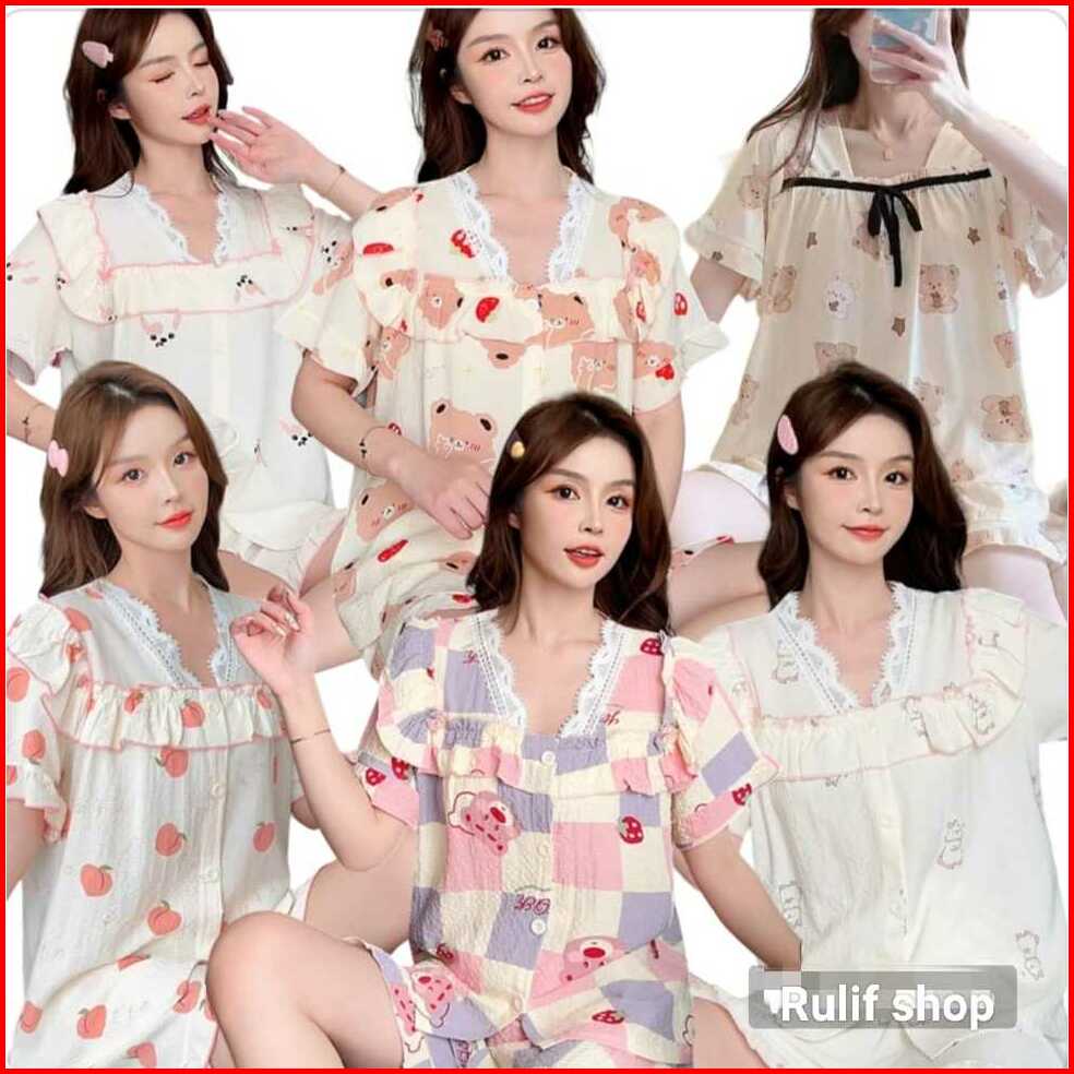 Baju Tidur Wanita Piyama Lengan Pendek Import Celana Pendek Pakaian Wanita Oneset Renda Cherry
