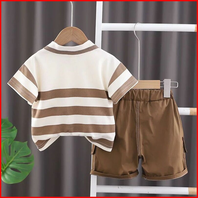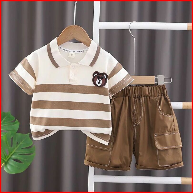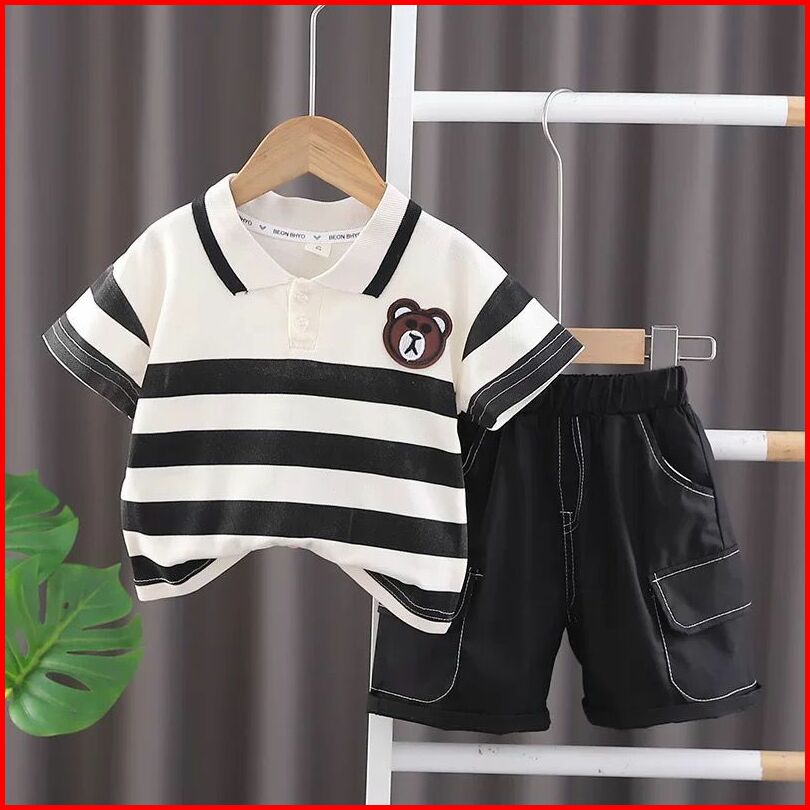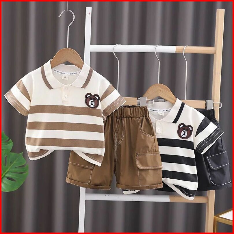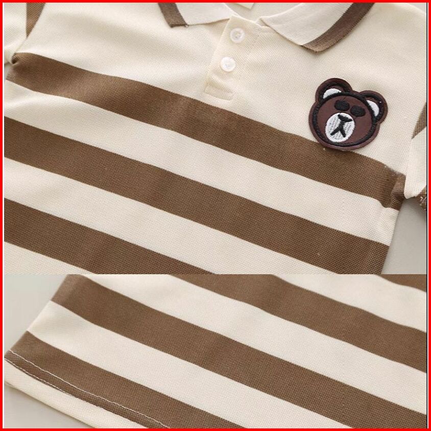 Setelan Lengan Pendek Motif Salur Bear Premium Usia 6 Bulan - 5 Tahun Setelan Anak Laki Laki Keren