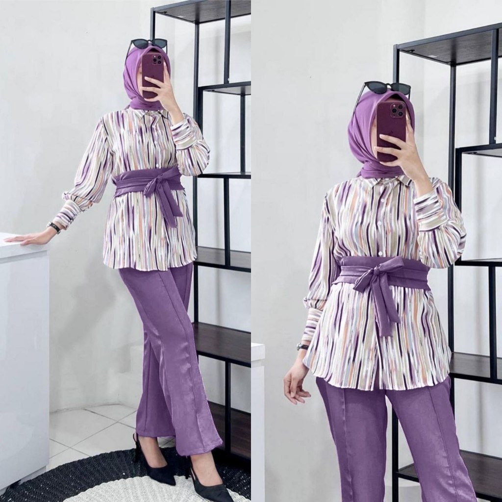 One Set Wanita Kemeja Rayon Super Premium Nadine Set - Setelan Baju Set Celana Panjang Kekinian Ld 110 Cm Terlaris