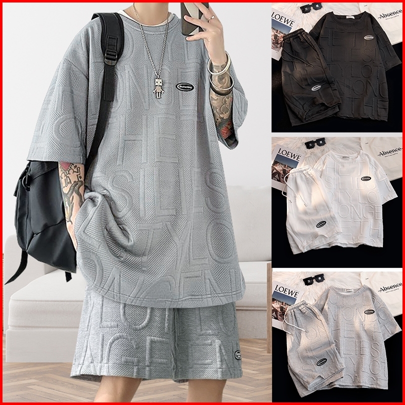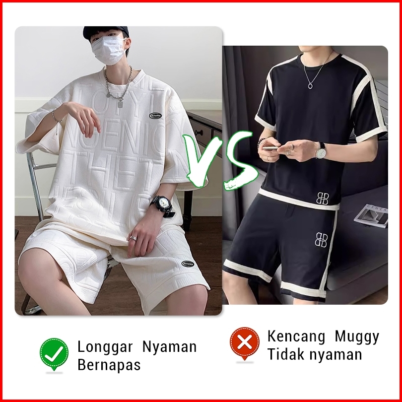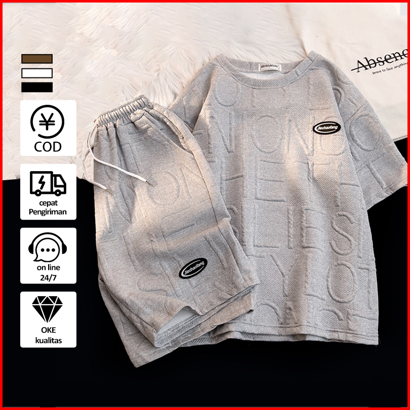 Baju Olahraga Satu Set Pakaian Pria Polos Setelan Kaos Leher Bulat Celana Pendek Loose Kasual Sport Setelan Pria Dewasa