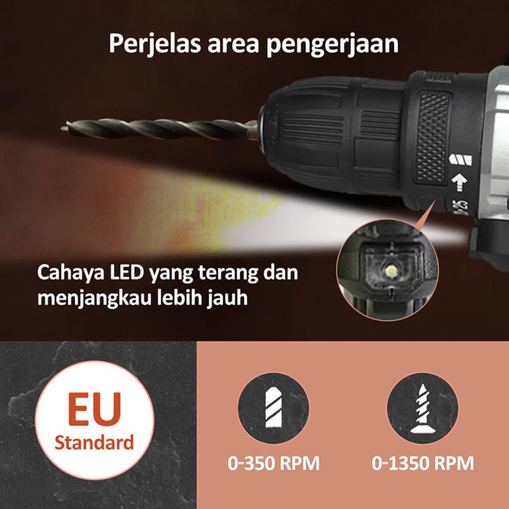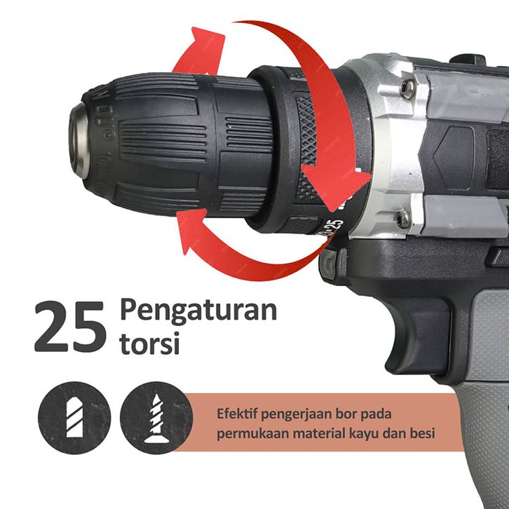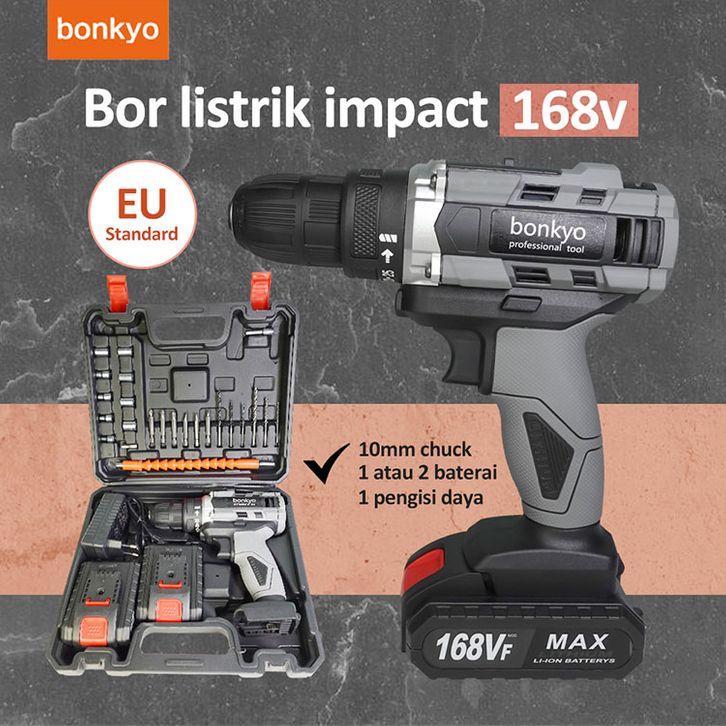 Bonkyo Mesin Bor 2 Baterai Mesin Bor Tangan Listrik Cordless Dual Speed Bolak Balik Beton Besi Bor kayu