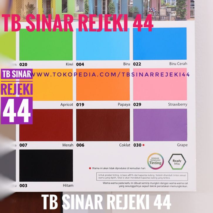 030 GRAPE UNGU TUA, 031 SANDSTONE, BW BRILLIANT WHITE A, 063 SAKURA , 060 PINEAPPLE , 036 BIRU LAUT, 061 ORANGE, 034 GUAVA, 033 ABU VULKANIK, 066 SAFARI, 025 BANANA, 032 LAKESTONE , 065 PEACHY, 059 BIRU DONGKER, MW M WHITE, 062 CARROT, 064 RED APPLE, 058 TOSCA, 057 LIME, 035 CHAMPAGNE , 026 APPLE, 029 STRAWBERRY, 022 BIRU CERAH , 024 GUN METAL, 019 PAPAYA , 020 KIWI, 021 MELON, 011 MOCHA , 017 KUNING, 006 COKLAT , 007 MERAH, 003 HITAM , 004 BIRU, 001 TRANSPARAN, 002 ABU TUA TINTING, 009 PUTIH TINTING , 010 ABU MUDA TINTING