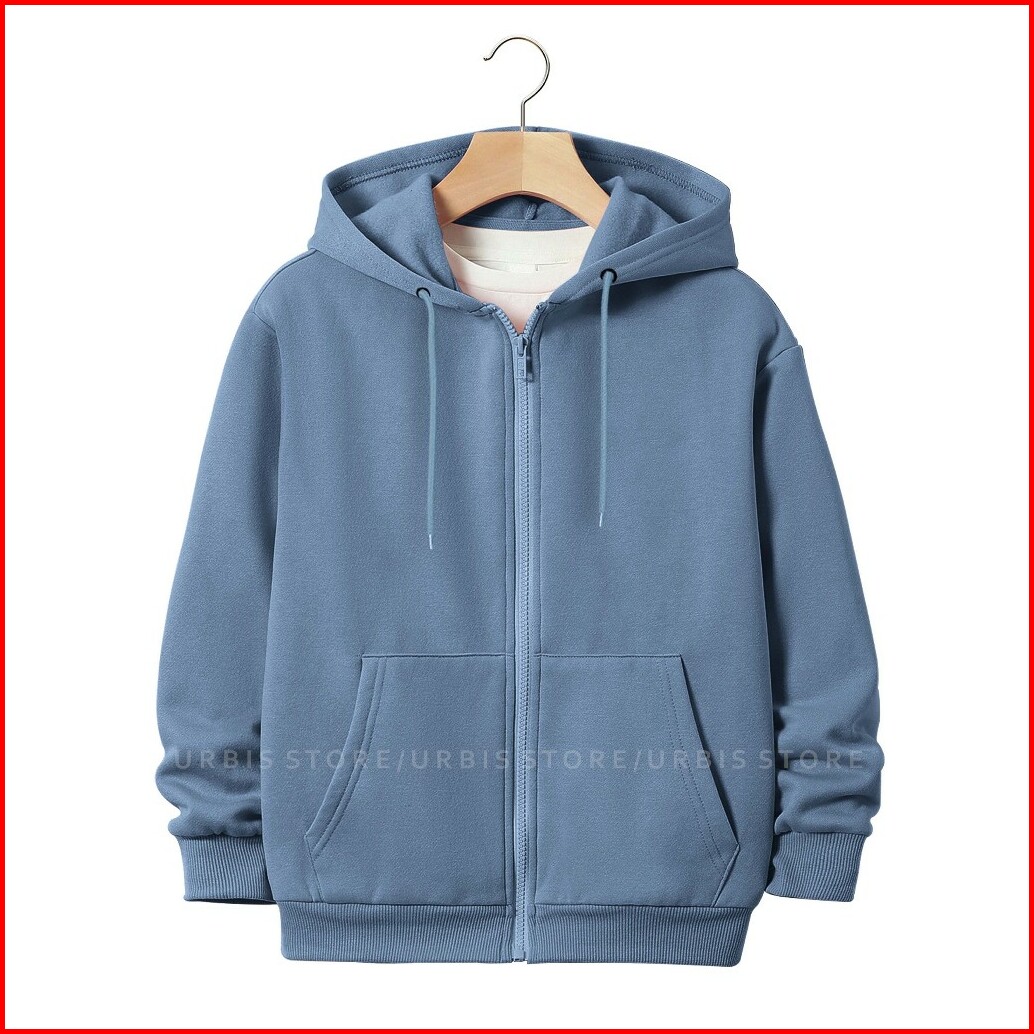 Sweater Hoodie Zipper Polos Anak Laki-laki Perempuan Usia 3-13 Tahun Warna Biru Denim Bahan Fleece Tebal Premium