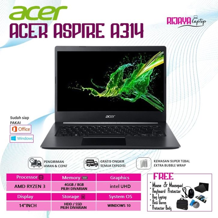 [ ready ] LAPTOP ACER ASPIRE A314 AMD RYZEN 3-3250U RAM 8GB/SSD 512GB 14INCH FREE TAS LAPTOP-MOUSE