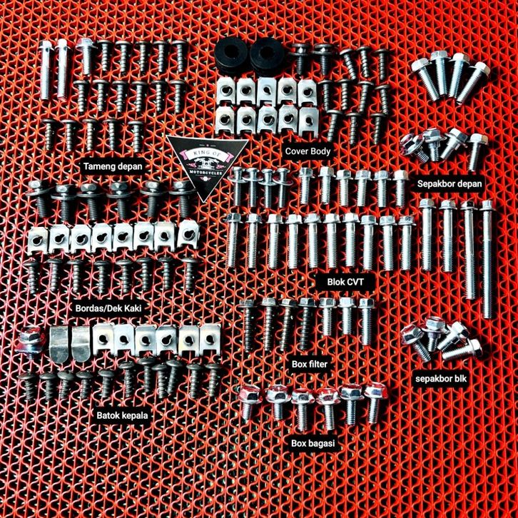 Baut body lengkap , Fullset+blok cvt, Blok cvt+cover cvt, Tameng depan , Batok kepala, Cover body, Dek kaki, Sepakbor dpn , Sepakbor blk, Box bagasi , Box filter , Behel