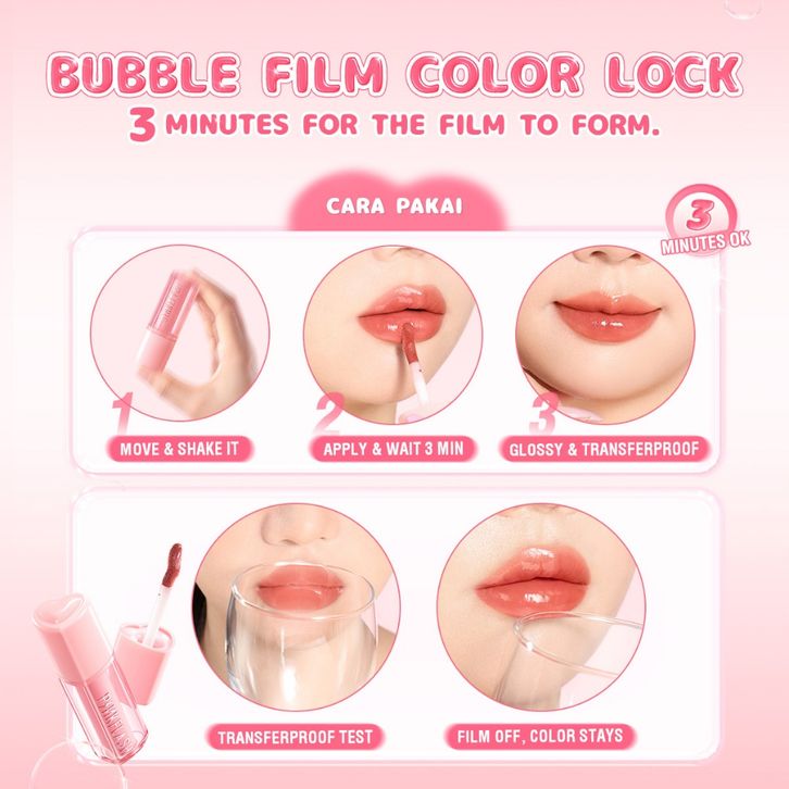 LIP TINT PINKFLASH TRANSFERPROOF BUBBLE GLOWY LONG LASTING SMOOTH AND FRESH 5 SHADES TAHAN LAMA