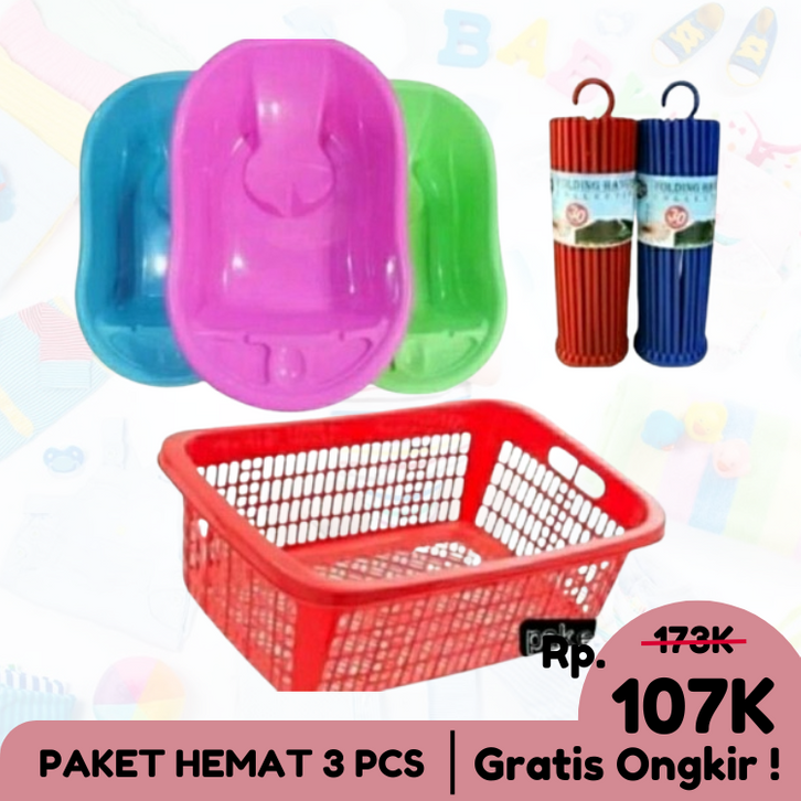 PAKET HEMAT BAK MANDI BAYI + KERANJANG BAJU BAYI + FOLDING 30 STIK BATHTUB BAYI BAK MANDI PLASTIK