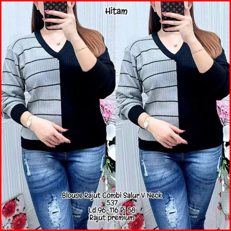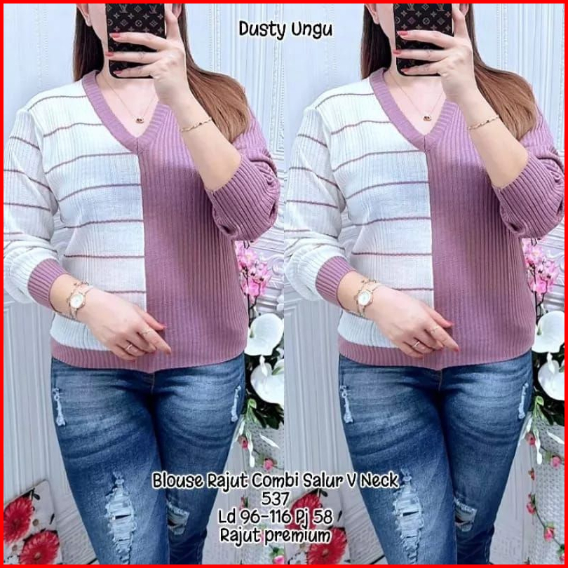 Atasan Rajut Combi Salur V Neck Knit Salur Wanita - Gestrick
