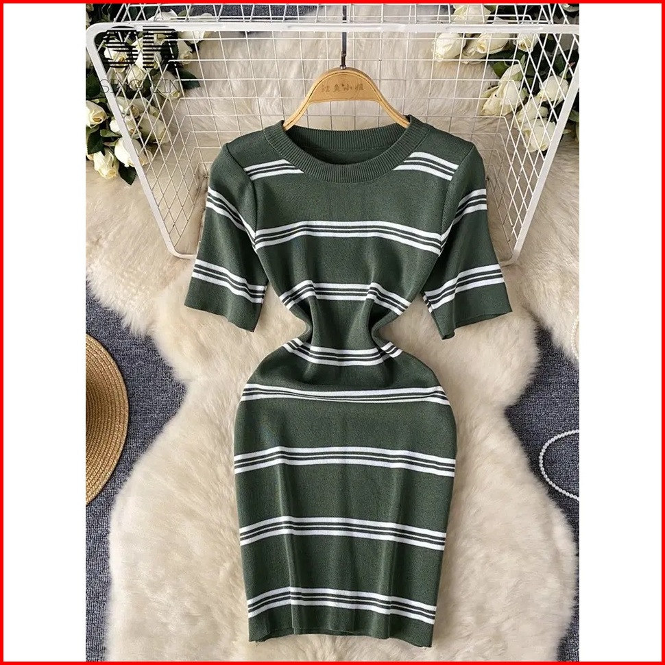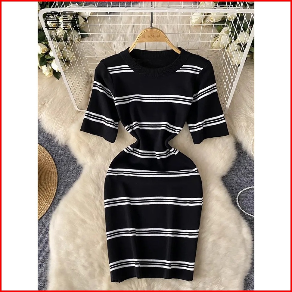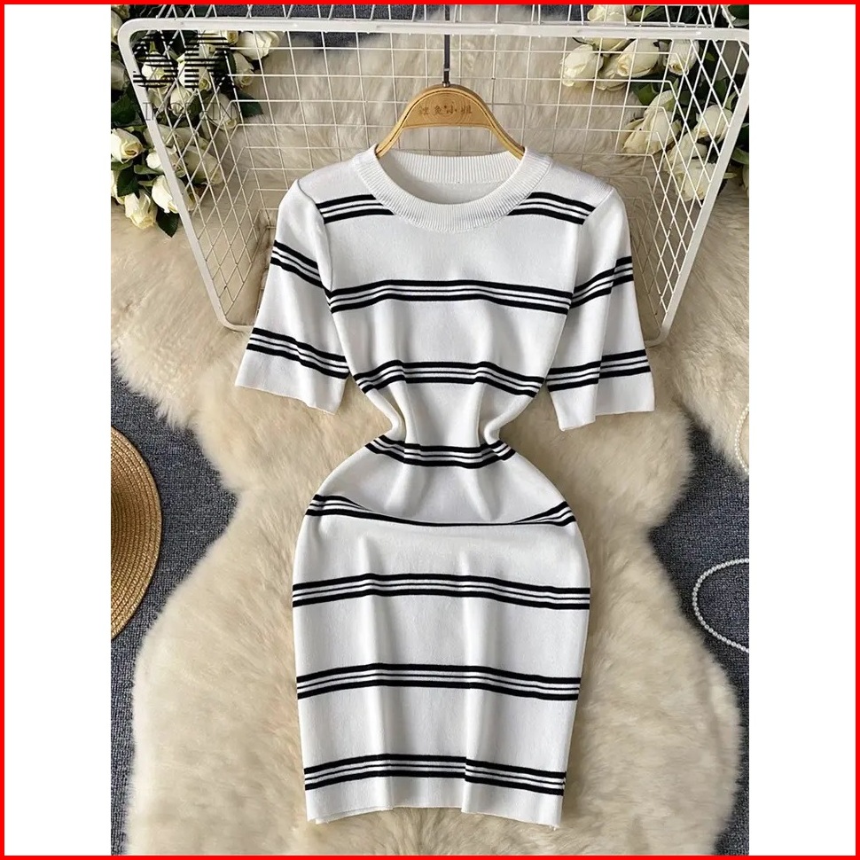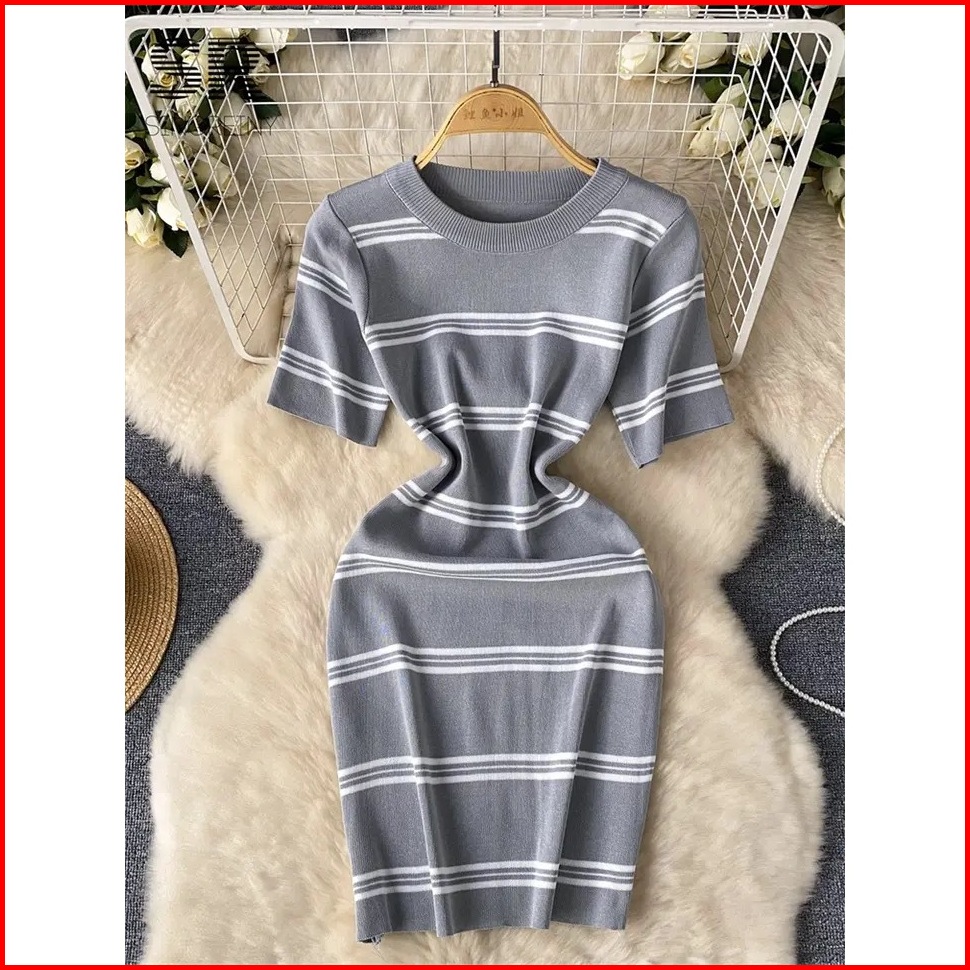 Leona Gaun Pendek Rajutan Strip Gaun Mini Ramping Korea Bodycon Elastis Lengan Pendek - Gestrick